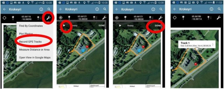 b) Önnur smáforrit. Til eru mörg önnur smáforrit eða öpp sem hægt er að nota til að hnita línur, vista hnitin á GPX-formi og senda skrárnar. Ef fólk er vant að nota slík smáforrit er sjálfsagt að nota þau áfram. Þar má t.d. nefna smáforritin Geo Tracker og Strava.