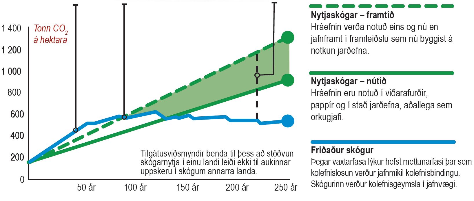Línuritið hér að neðan sýnir samanlagðan loftslagsávinning af tvenns konar nýtingarmöguleikum skógar í Suður-Svíþjóð. Í bláu leiðinni er nytjum hætt og allur skógurinn látinn þróast eins og verða vill. Í grænu leiðinni er haldið áfram að hirða um skóginn eins og venjan er og taka af nettóvextinum til nytja.