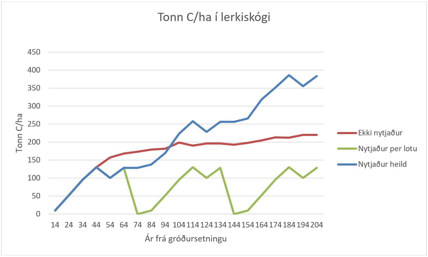 Myndin sýnir spá um kolefnisbindingu í lerkiskógi þar sem notaðar voru vaxtarjöfnur til að framreikna vöxt og varð til við keyrslu á forritinu IceForest sem Timo Pukkala þróaði miðað við mælingar í íslenskum lerkiskógum, mest á Héraði. Spáin er því raunhæf miðað við vöxt rússalerkis við íslenskar aðstæður. Forsendur spárinnar eru annars vegar þær að lerkiskógur sé gróðursettur og síðan látinn eiga sig án nokkurra aðgerða í 200 ár (rauða línan) og hins vegar þær að sams konar skógur sé nytjaður með einni grisjun í hverri lotu, lokafellingu og endurnýjun yfir sama tímabil (græna línan). Í þeirri meðferð er miðað við að grisjun sé ekki ykja mikil og að lokafelling eigi sér stað þegar vöxtur lerkisins er orðinn hægur. Þannig hámarkast arðsemi og kolefnisbinding verður einnig mikil. Bláa línan sýnir uppsafnaða kolefnisbindingu í nytjaskóginum miðað við að megnið af timbrinu úr grisjuninni verði kurlað og eigi því stuttan líftíma en að megnið af timbrinu úr lokafellingunni eigi sér langan líftíma sem borð og plankar í byggingum. Ekki er ágóðinn af því að nota timbur í stað jarðefnaeldsneytis eða steinsteypu tekinn með, en þá næði bláa línan enn hærra.