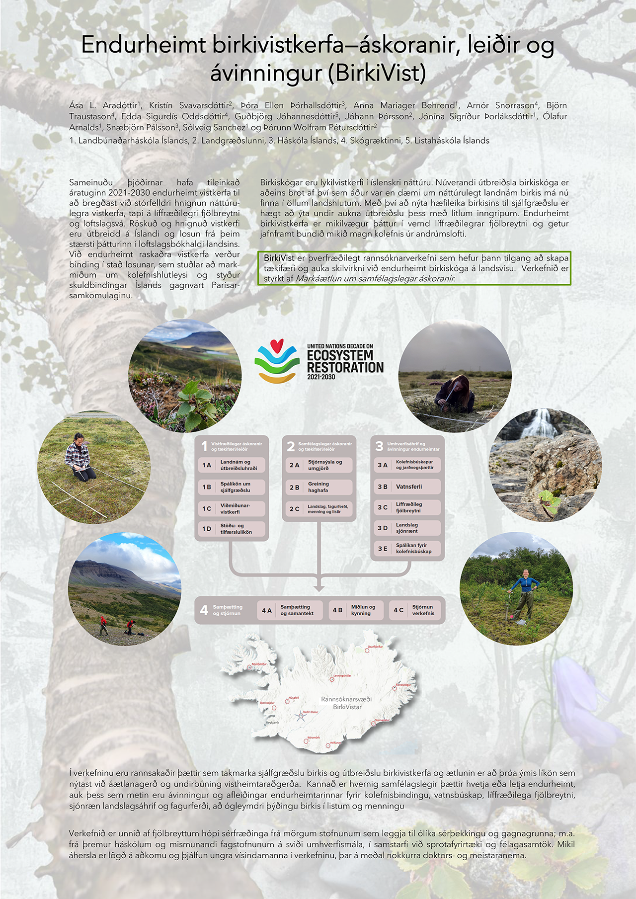 Hnignun náttúrulegra vistkerfa samfara tapi á líffræðilegri fjölbreytni og loftslagsvá eru mestu áskoranir jarðarbúa á þessari öld. Því hafa Sameinuðu þjóðirnar tileinkað áratuginn 2021-2030 endurheimt vistkerfa. Hnignuð og röskuð vistkerfi eru útbreidd á Íslandi og losun frá þeim stærsti þátturinn í loftslagsbókhaldi landsins. Birkiskógar eru lykilvistkerfi í íslenskri náttúru og veita margháttaða og verðmæta vistkerfisþjónustu en núverandi útbreiðsla birkiskóga er aðeins brot af því sem áður var. Víðtæk endurheimt birkivistkerfa hefur fjölþætta samfélagslega, menningarlega, efnahagslega og ekki síst umhverfislega skírskotun, þar sem hún stuðlar að vernd líffræðilegrar fjölbreytni á Íslandi jafnframt því að vera leið til að binda umtalsvert magn kolefnis úr andrúmslofti inn í vistkerfin.