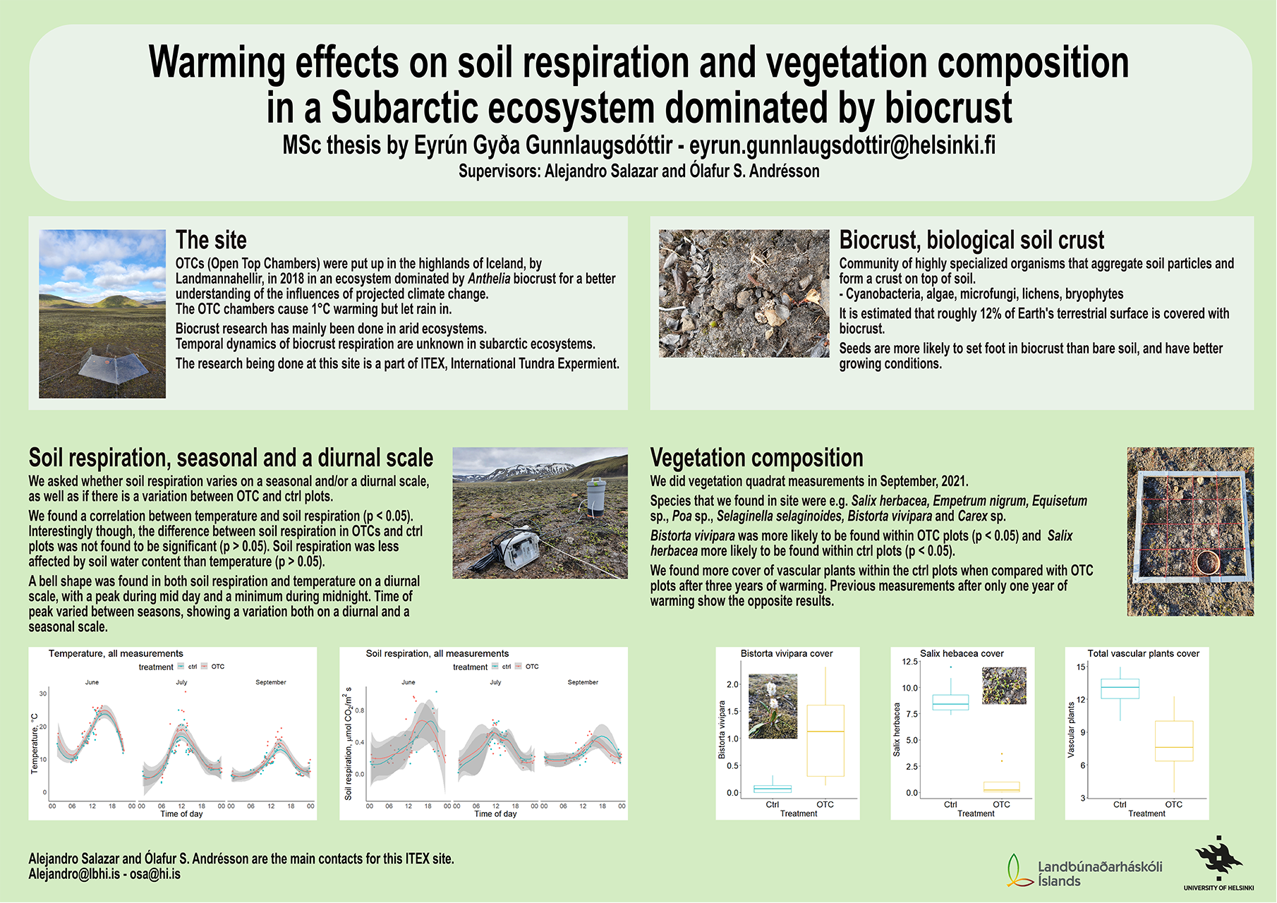Sumarið 2021 voru farnir þrír leiðangrar að Landmannahelli með u.þ.b. mánaðar millibili. Þar var jarðvegsöndun í jarðvegsskán mæld á mismunandi tímum sólarhrings í hverri ferð, með tækjum sem hönnuð hafa verið af Ólafi Andréssyni og teymi hans. Fjölbreytileiki plantna var einnig rannsakaður með notkun plönturamma. Svæðið samanstendur af 16 mælipunktum og helmingur þeirra hulinn OTC-klefum sem valda 1°C-2°C hlýnun. Markmið rannsóknarinnar er að sjá hvort munur sé á jarðvegsöndun á milli hlýrri punkta og viðmiðunarpunkta, og hvort það er á sólarhrings- eða árstíðagrunni. Einnig er um samanburð á plöntutegundum á milli OTC- og viðmiðunarpunkta að ræða og á hvaða hátt OTC-klefarnir valda breytingum á samsetningu plöntutegunda, sem og líffjölbreytileika þeirra. Leiðbeinendur verkefnisins eru Alejandro Salazar-Villegas (LbHÍ), Ólafur Andrésson (HÍ), Jussi Heinonsalo (UH) og Kristiina Karhu (UH). Verkefnið er unnið við háskólann í Helsinki (UH).