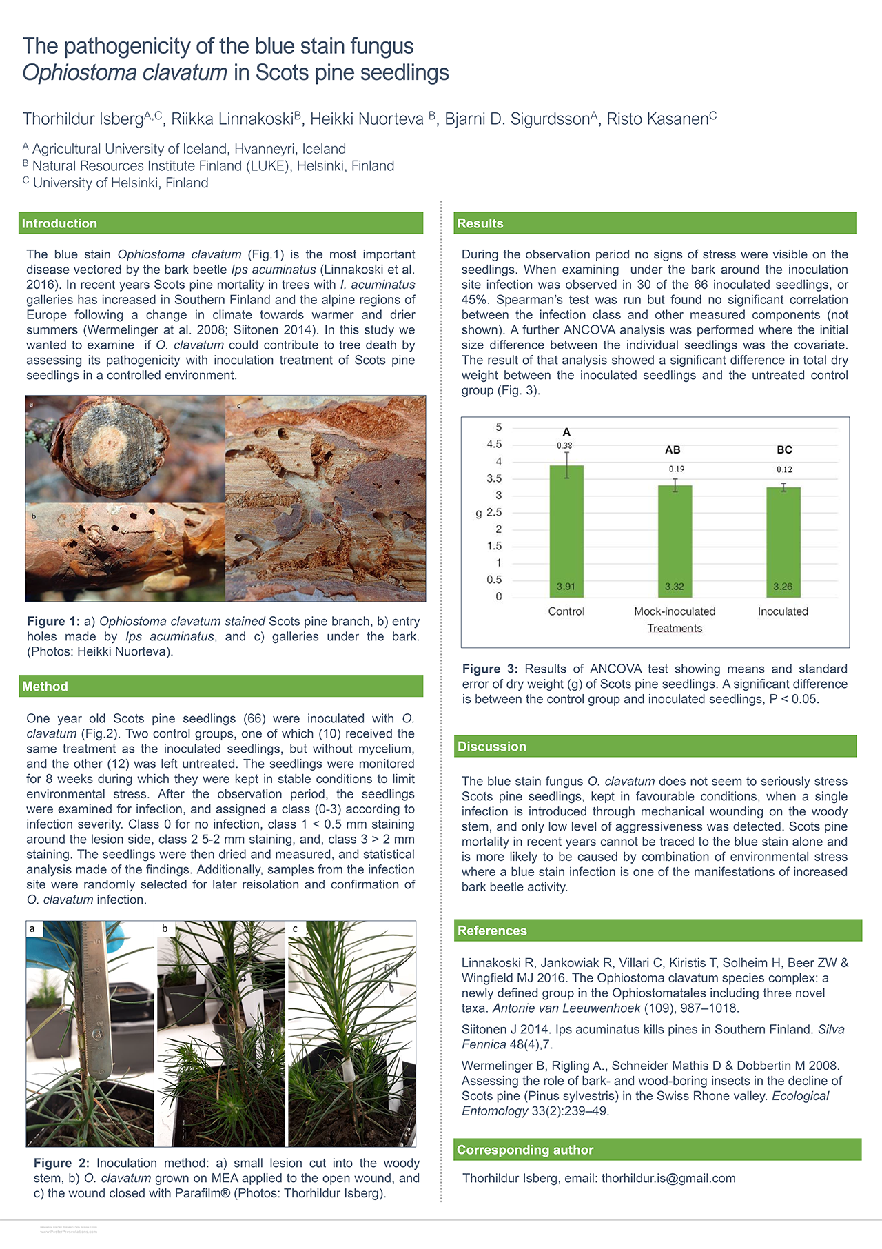 Hér var sýkingarmætti grágeitarsveppsins Ophiostoma clavatum í fræplöntum skógarfuru kannað. Í kjölfar loftslagsbreytinga undanfarinna áratuga hefur árásarharka barkarbjöllunnar Ips acuminatus gagnvart skógarfuru aukist töluvert í Finnlandi sem og fjallahéruðum Evrópu, en I. acuminatus ber smit af O. clavatum á milli trjáa. Rannsóknin var hönnuð með það fyrir augum að kanna hvert sýkingarmætti O. clavatum væri og hvort smitið eitt og sér gæti orsakað trjádauða. Við framkvæmdina var 90 fræplöntum skipt í viðmiðunarhóp, viðmiðunarhóp með gervismiti og smithóp. Fylgst var með plöntunum í átta vikur og í lok þess tímabils voru ýmsar mælingar framkvæmdar sem og smit kannað. Helsta niðurstaðan var að sýkingamætti O. clavatum er lítið sem ekkert. Sá skaði sem sýkt tré verða fyrir í náttúrunni er líklegast afleiðing ýmissa samverkandi þátta sem veikja tréð og geta valdið dauða þess.