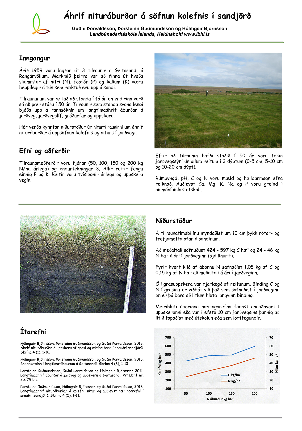 Árið 1959 voru lagðar út þrjár tilraunir á Geitasandi á Rangárvöllum. Markmið þeirra var að finna út hvaða skammtar af nitri (N), fosfór (P) og kalíum (K) væru heppilegir á tún sem ræktuð eru upp á sandi. Tilraununum var ætlað að standa í fá ár en endirinn varð sá að þær stóðu í 50 ár. Tilraunareitir voru slegnir árlega og uppskera mæld. Tilraunir sem standa svona lengi bjóða upp á rannsóknir á langtímaáhrifum áburðar á jarðveg, jarðvegslíf og uppskeru. Hér verða kynntar niðurstöður úr niturtilrauninni á áhrifum nituráburðar á uppsöfnun kolefnis og niturs í jarðvegi.