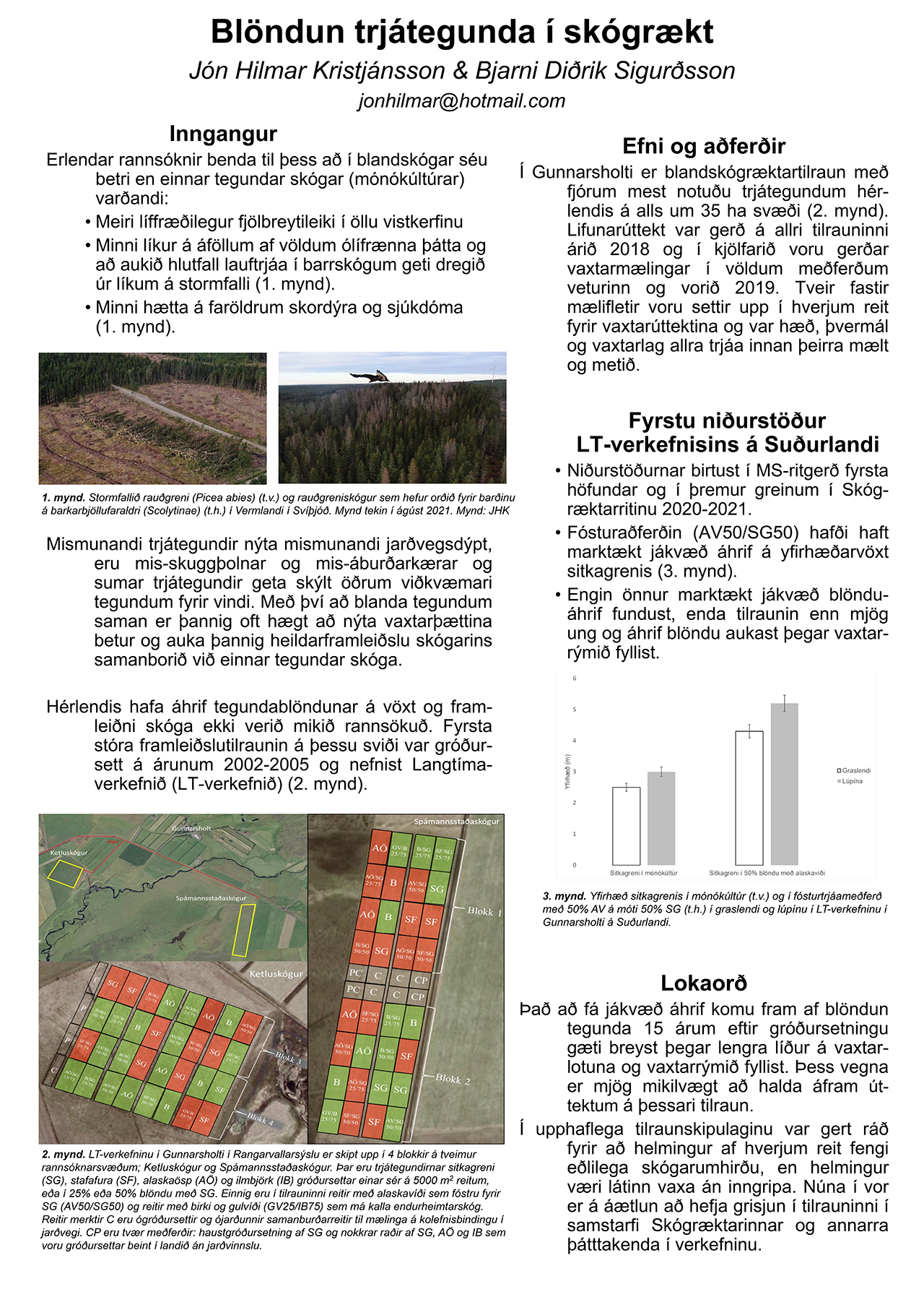 Áhrif tegundablöndu á vöxt trjáa í skógi hafa verið rannsökuð mun meira á annars staðar á Norðurlöndum en á Íslandi. Það er þó mikilvægt að skoða áhrif tegundablöndu við íslenskar aðstæður vegna þess að hér eru bæði jarðvegsskilyrði og veðurfar með öðru móti en gengur og gerist annars staðar og á Íslandi eru notaðar tegundablöndur sem sjaldnast eru ræktaðar í öðrum löndum. LT-verkefnið er fyrsta tilraunin hér á landi með trjátegundablöndu í stórum samfelldum reitum (0,5 ha) í blokkum sem endurteknar voru við sömu jarðvegsskilyrði. Í Gunnarsholti á Rangárvöllum voru bornar saman tegundirnar birki (Betula pubescens), sitkagreni (Picea sitchensis), stafafura (Pinus contorta) og alaskaösp (Populus trichocarpa). Tegundirnar voru ýmist ræktaðar einar sér, í 50% eða 25% blöndu með sitkagreni. Eitt af meginmarkmiðum rannsóknarverkefnisins var að skoða hvort einhver munur væri á lifun, vexti, framleiðni og vaxtarlagi trjáa í tegundablönduðum reitum samanborið við einnar tegundar reiti. Fósturaðferðin (50% sitkagreni/50% alaskavíðir (Salix alaxensis)) hafði marktækt jákvæð áhrif á yfirhæðarvöxt sitkagrenis. Einu marktæku blönduáhrifin í öðrum meðferðum voru neikvæð hæðarvaxtaráhrif blöndu samanborið við einnar tegundar reiti, óháð trjátegund. Það að engin jákvæð áhrif komu fram af blöndun tegunda 15 árum eftir gróðursetningu gæti breyst þegar lengra líður á vaxtarlotuna og vaxtarrýmið fyllist.