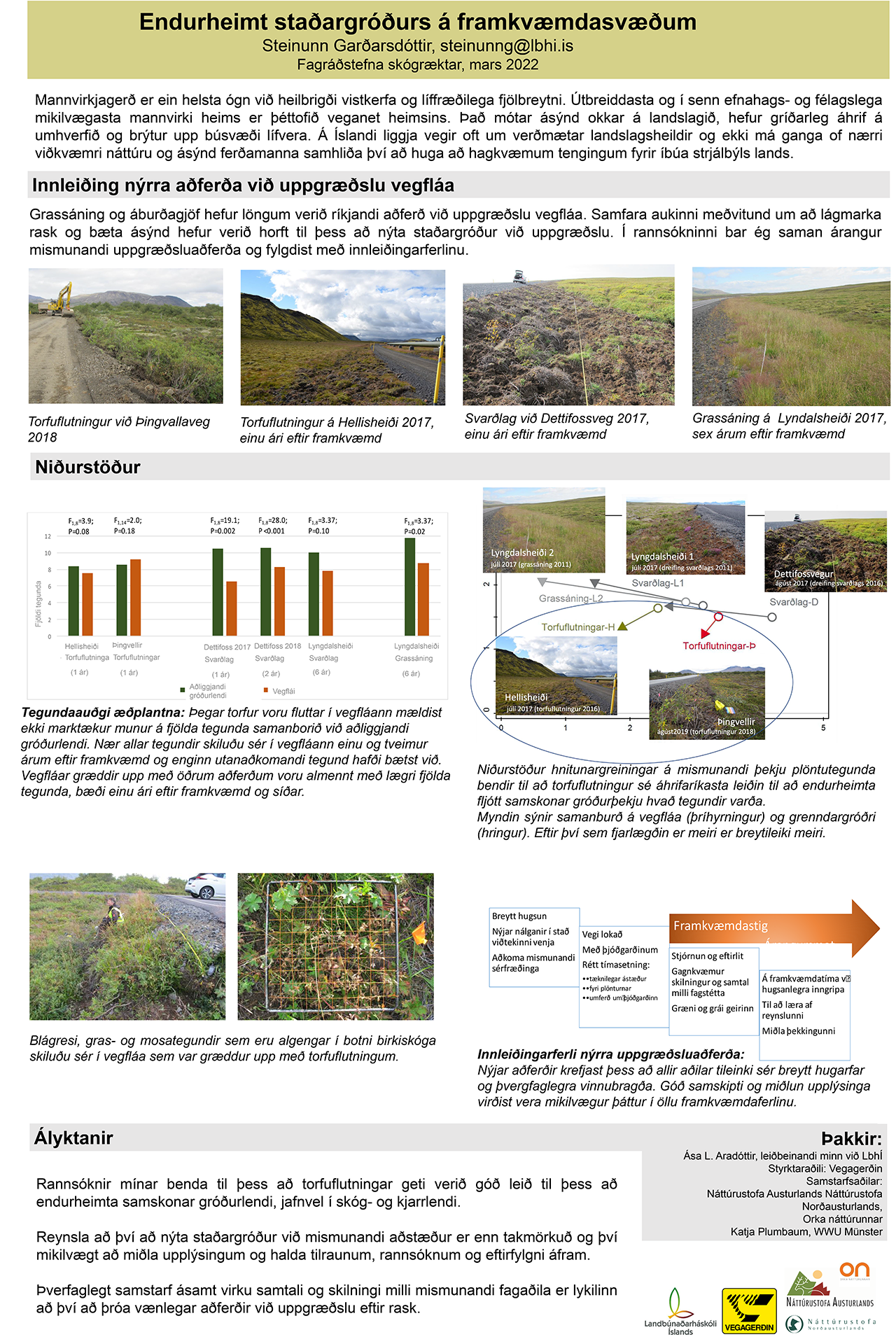 Til að draga úr umhverfisáhrifum framkvæmda hefur færst í vöxt að leita leiða við að nýta staðargróður til að græða upp röskuð svæði. Rannsóknir hafa sýnt góðan árangur af því að nýta aðferðir sem miða að endurheimt staðargróðurs. Í meistaraverkefni mínu hjá LbhÍ skoða ég árangur af notkun mismunandi aðferða við uppgræðslu vegfláa sem liggja um verðmætar landslagsheildir, m.a. við Þingvallaveg og Dettifossveg. Jafnframt fylgdist ég með innleiðingarferli nýrra aðferða.