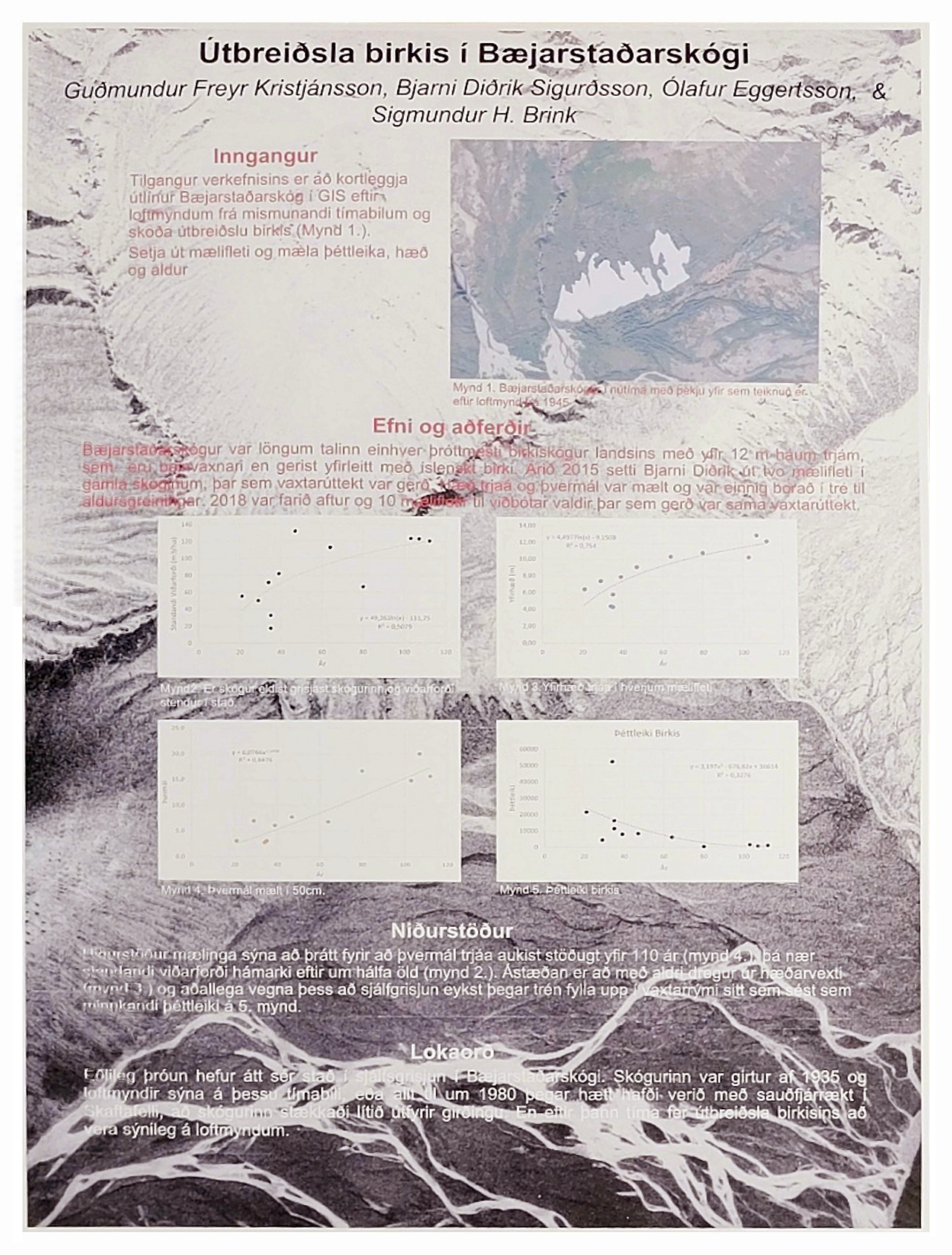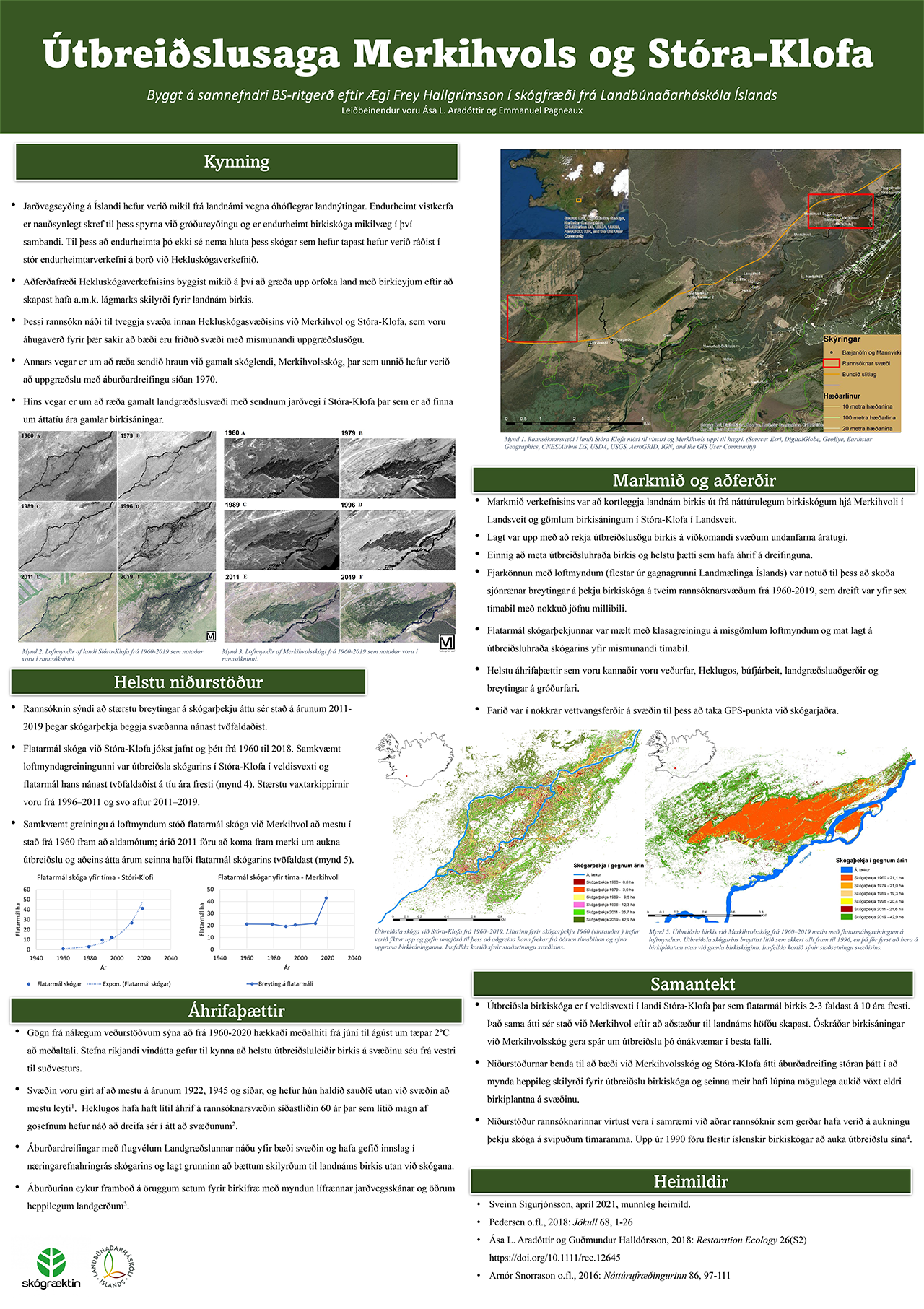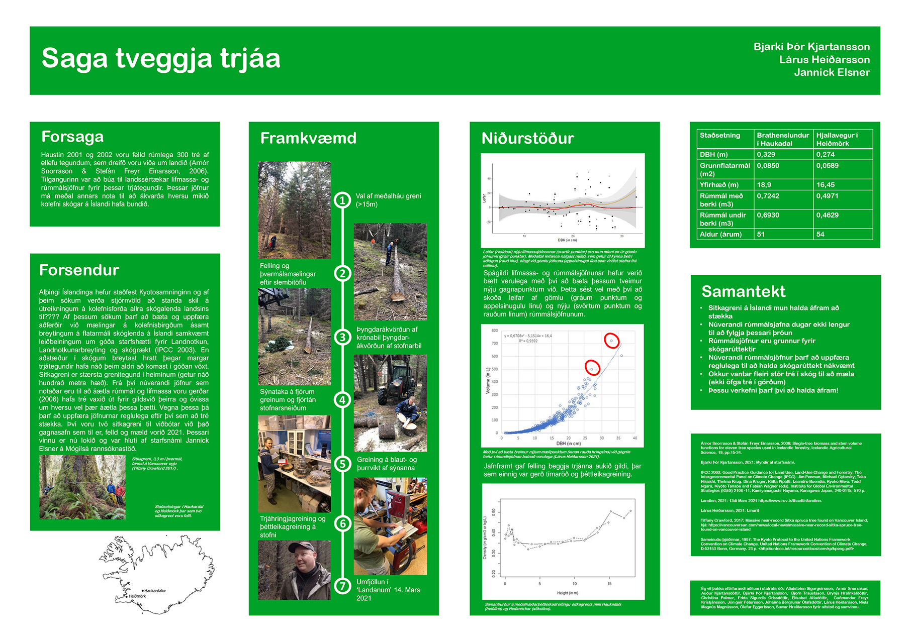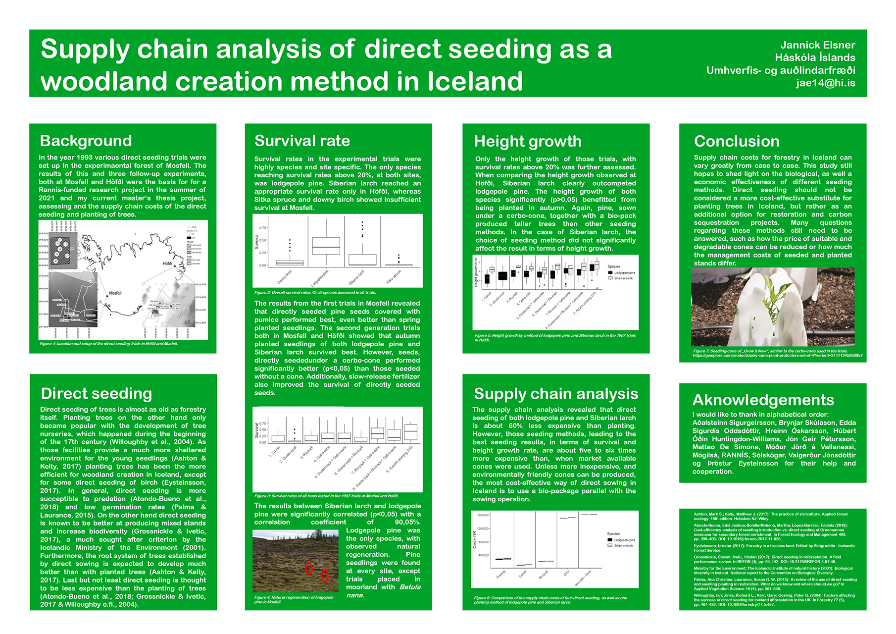 Gróðursetning eða bein sáning, hvor aðferðin er arðbærari til ræktunar, vistkerfisins vegna eða sem afkastamiklir skógarlundir? Til að svara þessari spurningu voru átján skógarlundir í Mosfelli og á Höfða endurheimsóttir sumarið 2021, en þar var sáð og gróðursett á árunum 1993-2004. Endurheimsóknin var til að mæla ýmsar breytur og til að rannsaka þróun birkis, sitkagrenis, rússalerkis og stafafuru á þessum svæðum. Aðaláhugasviðið í þessu verkefni var að skoða tegundabundin áhrif af mismunandi sáningsaðferðum. Sérstaklega var horft til þess hvort plöntunar komust á fót, en það hjálpar mjög mikið til að komast að lokaniðurstöðu um kostnaðarhagkvæmni af gróðursetningaraðgerðum eða beinni sáningu. Ferlar gróðursetningar- og sáningaraðferða voru bornir saman í samhengi við hvað væri hagkvæmast. Fyrstu niðurstöður þessarar rannsóknarvinnu verða kynntar á veggspjaldinu.