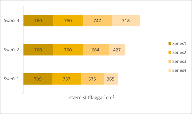 Á vaxtartíma (1. júní-17. ágúst) varð engin stytting á slitflöggunum á skýldu svæðunum 2 og 3 en nokkurt slit varð á flöggum á skjóllausu svæði 1. Stytting á flöggum á svæði 1 var samtals 44 cm² (5,8% af flatarmáli) á fyrstu tveimur flöggum tímabilsins. Mun meira slit varð á næstu tveimur tímabilum (seríum) slitflagga sem stóðu yfir haustmánuðina; en seríu 3 lauk 7. október og seríu 4 lauk 19. nóvember. Samanlagt slit seinni tveggja seríanna var mest (38,2%) á skjóllausu svæði 1. Þá var slitið samtals 28,2% á svæði 2 sem hafði nokkurt skjól, en minnst (3,6%) á Svæði 3 sem var í miklu skjóli (1. mynd)