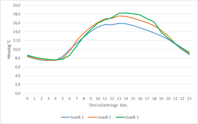 Skjólmeðferðirnar drógu martækt úr meðal- og hámarksvindhraða (t-próf: p<0,001) á skýldum stöðum miðað við berangur. Meðaltöl hitastigs yfir rannsóknatímabilið voru einnig marktækt hærri á skýldu svæðunum en á óskýldu svæði (t-próf: p<0,01). Dagshiti í 200 cm hæð var 0,6 °C hærri í miklu skjóli en á berangri, en 1,6 °C hærri í 10 cm hæð frá yfirborði (2. mynd), og 1,1 °C hærri á 10 cm dýpi í jarðvegi.