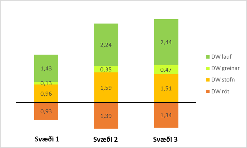 Mæling á lífmassa birkiplantna á meðferðasvæðunum þremur sýndi að skjólið hafði aukið vöxtinn marktækt (t-próf, p<0,001) á báðum skýldu svæðunum miðað við svæði 1. Lífmassi í sumarlok vað að jafnaði 71,8% meiri á svæði 2 og 78,5% meiri á svæði 3, miðað við svæði 1 (3. mynd).