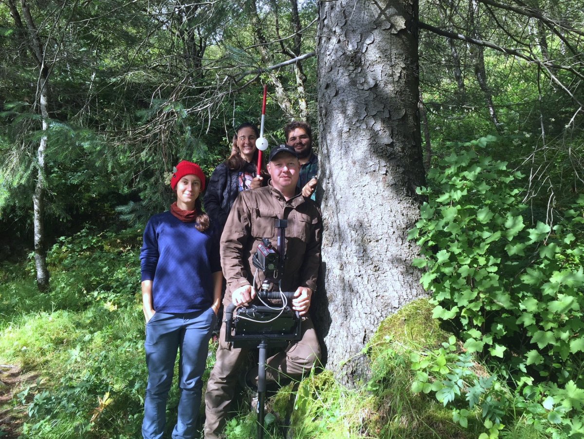 Hæsta tréð þarf ekki að vera það sama og stærsta tréð. Sitkagrenið sem Bjarki stendur hér við ásamt skógfræðinemunum Pedro, Ritu og Josefin er einum metra lægra en hæsta tréð. Á hinn bóginn er það miklu sverara og þar með efnismeira. Þetta stæðilega tré hefur bundið rúm þrjú tonn af koltvísýringi á tæplega 70 ára ævi sinni. Myndina tók Björn Traustason.