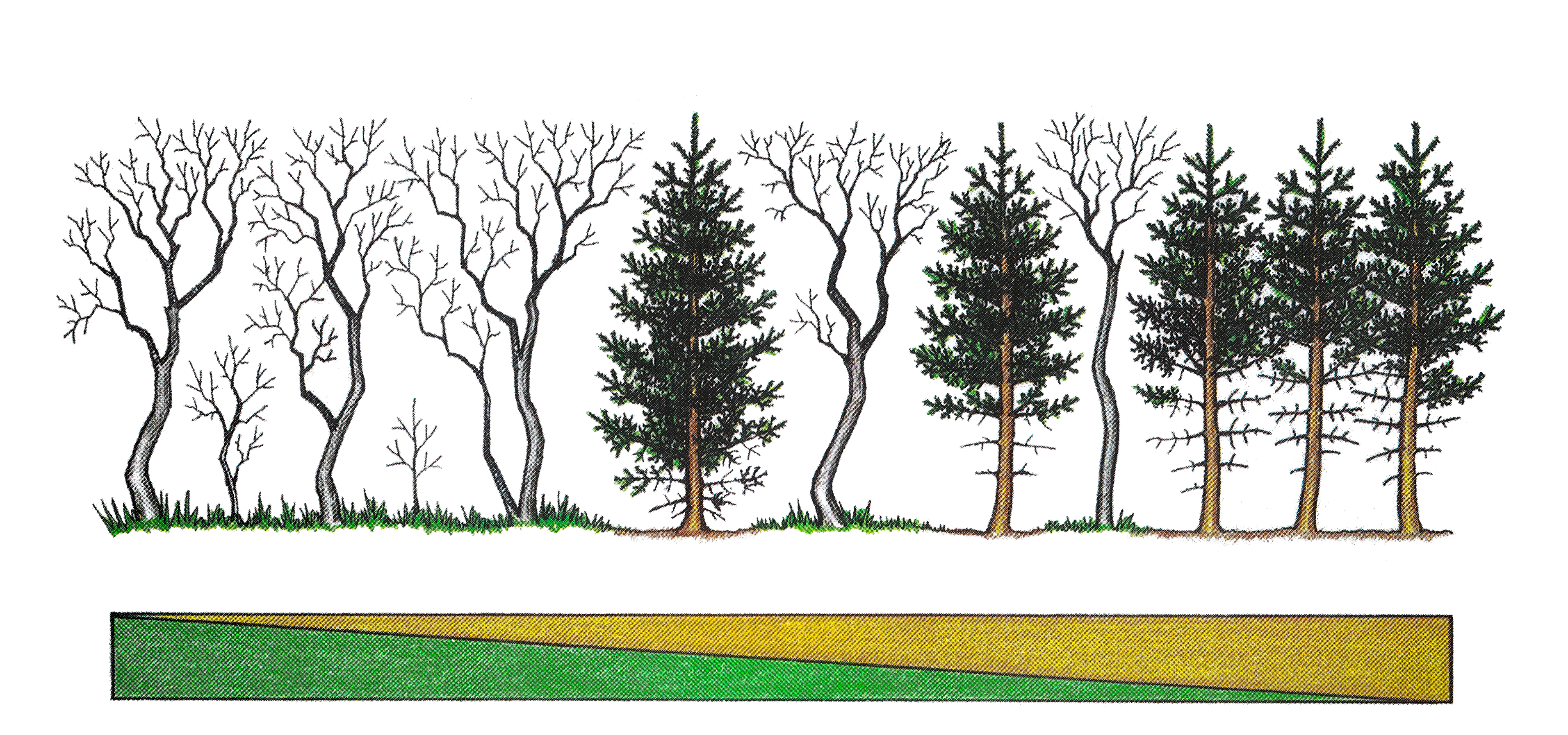 Sumargræn lauftré og sígræn barrtré eru sjónrænar andstæður sem saman geta gert skógarmyndina áhugaverð­ari. Við sama þéttleika eykur vaxandi hlutdeild sígrænna barrtrjáa á skyggingu skógarsvarðarins og dregur úr grósku og þekju háplantna. Besta skógarmyndin fæst með því að lauftrén séu í meirihluta. Teikning ÞHJFyrirbæri eins og fegurð, upplifun og útivistargæði skýrast mikið til af birtunni í skóginum og fagurfræðilögmálum um fjölbreytni, andstæður og hlutföll. Sett er fram aðferð til að fella þessa þætti saman í yndisgildi skógar. Fyrir yndisgildið þarf upplýsingar um trjáfjölda á hektara, tegundir, yfir hæð trjánna, hæð trés af meðalgrunnfleti og grunnflöt trjáa skipt eftir tegund og skuggaþoli. Yndisgildi, skógarsýnd og yndissýnd má meta út frá venjulegum trjámælingagögnum án sérstakra athugana.