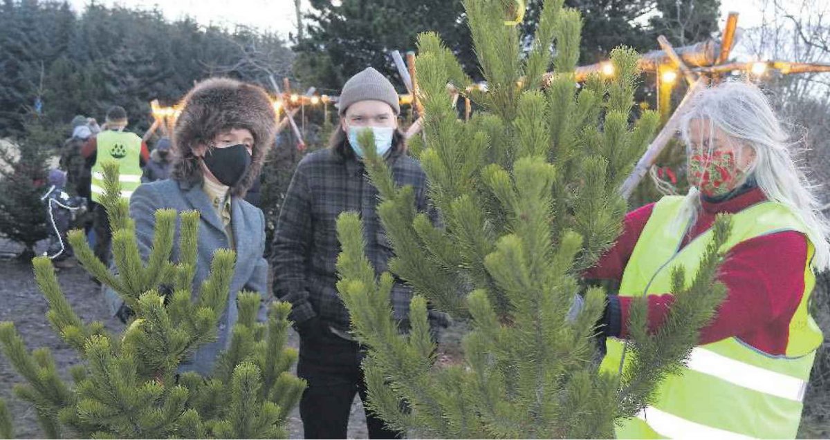 Jólamarkaður. Fólk hugar að kaupum á jólatrjám, en stafafura hefur lengi verið vinsælasta íslenska j…