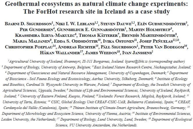 Seinni greinin nefnist á ensku Geothermal ecosystems as natural climate change experiments: The ForHot research site in Iceland as a case study og er eftir Bjarna Diðrik Sigurðsson og 20 aðra höfunda.