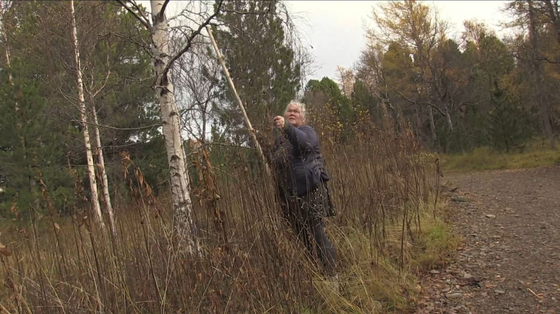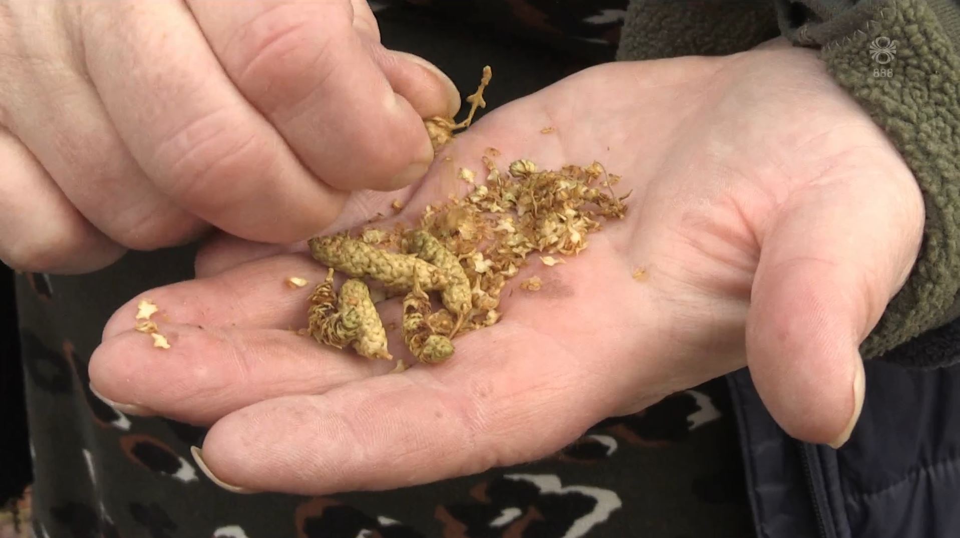 Bergrún Arna Þorsteinsdóttir aðstoðarskógarvörður með köngul af lindifuru. Ná þarf lindifurukönglunum fljótt því mýsnar eru sólgnar í fræið og fljótar að ná því eftir að köngullinn fellur af trénu. Skjámynd úr frétt Sjónvarpsins