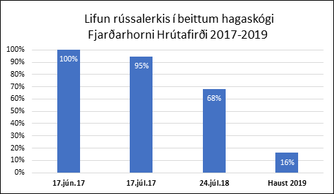 Við gróðursetningu í júní 2017 voru lagðir út sjö 100 m2 mælifletir. Að mánuði liðnum hafði plöntum fækkað lítillega (um 5%) en síðsumars árið eftir stóðu einungis 68% plantna eftir og margar með áberandi bitskemdir á toppsprota og greinum. Haustið 2019, að liðnum þremur vaxtarsumrum, fundust aðeins 9 af þeim 56 plöntum sem upphaflega voru gróðursettar, eða um 16%, og flestar þeirra hálfgerðir ræflar vegna bits og hugsanlega einnig kals.
