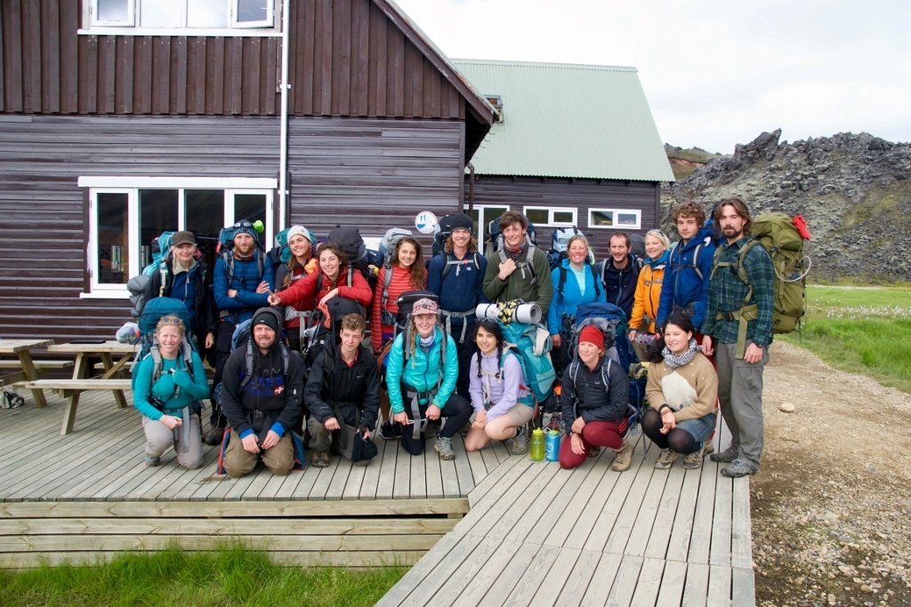 Lengsta dvöl sjálfboðaliðahópanna er sex vikur. Þessir hópar fá þó einnar viku frí um miðbik dvalarinnar til að ganga um landið. Hér er hópur frá því í sumar við skála í Landmannalaugum. Mynd: Melissa Steller.