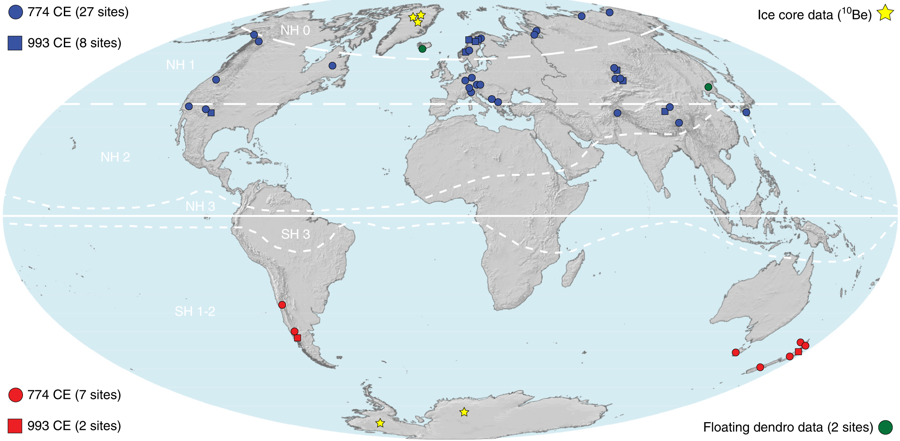COSMIC-gagnanetið. Myndin er úr greininni sem hér er fjallað um og sýnir dreifingu þeirra 44 árhringjasýna sem beðmi eða sellulósi var tekinn úr til að greina árlegt magn kolefnis-14 á árabilunum 770-780 og 990-1000 (hringir og ferningar). Sjálfstæð C14-gögn úr tveimur „fljótandi“ árhringjaröðum (grænt) og fimm sýni árlegs magns geislavirku samsætunnar beryllíns 10 tekin úr borkjörnum úr ís (gult). Hvítar brotalínur marka geislakolssvæði í andrúmslofti. Kortið er byggt á þekkingu greinarhöfunda og var unnið með ArcGIS-hugbúnaðinum frá Esri, útgáfu 10.1 SP1