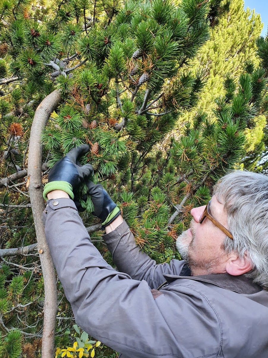 Nauðsynlegt er að þekkja nýja köngla frá eldri könglum á stafafurunni, vera með góða vettlinga og nota ákveðna tækni til að ná könglunum af. Ljósmynd: Skógræktarfélag Reykjavíkur Nú er mikið fræ á ýmsum trjátegundum í Heiðmörk. Aðalsteinn hafði fyrir helgina kannað fræmagn í furu- og grenikönglum og segir hann að fræið líti vel út. Mikið verði því af vel spírandi fræi af þessum tegundum í Heiðmörk ekki síður en af birki og fleiri tegundum. Kennslan fór fram við Borgarstjóraplanið svokallaða í Heiðmörk og ekki þurfti að leita langt þar eftir fræinu.