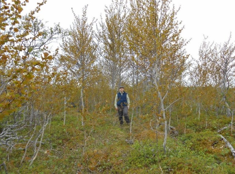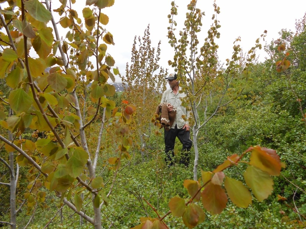 Lárus, sem er tæpir 2 m á hæð, innan um öspina í Jórvík í Breiðdal.