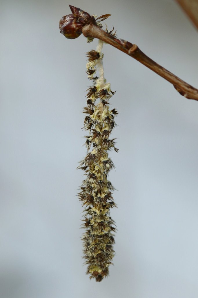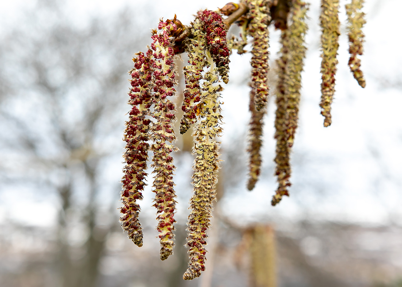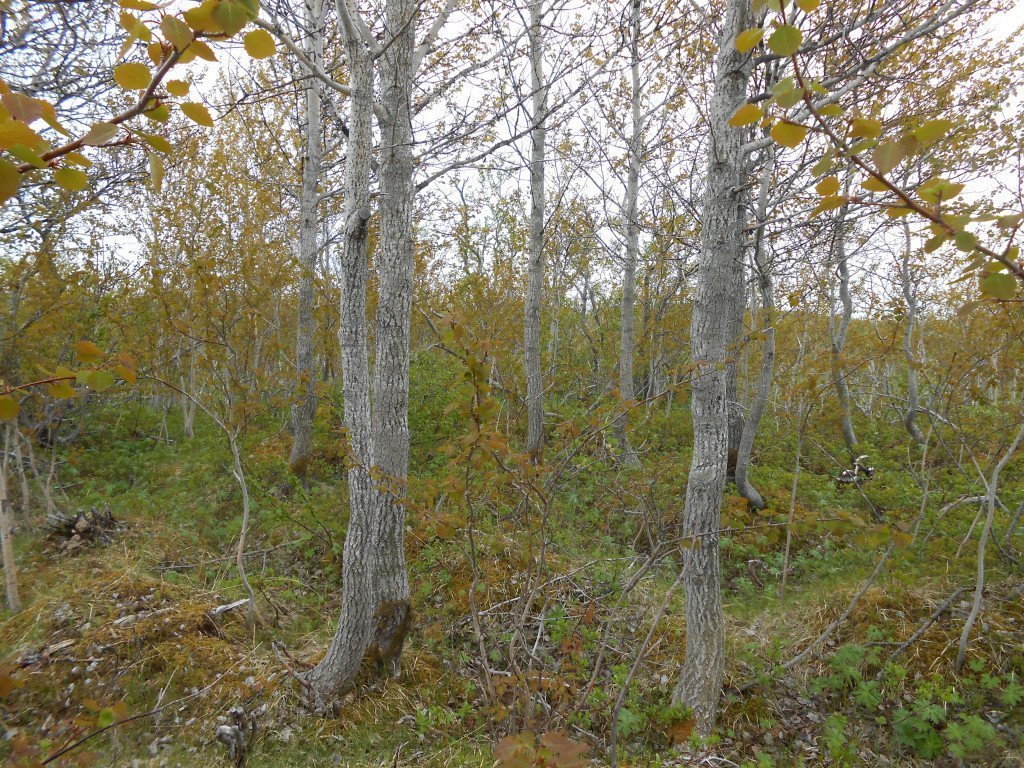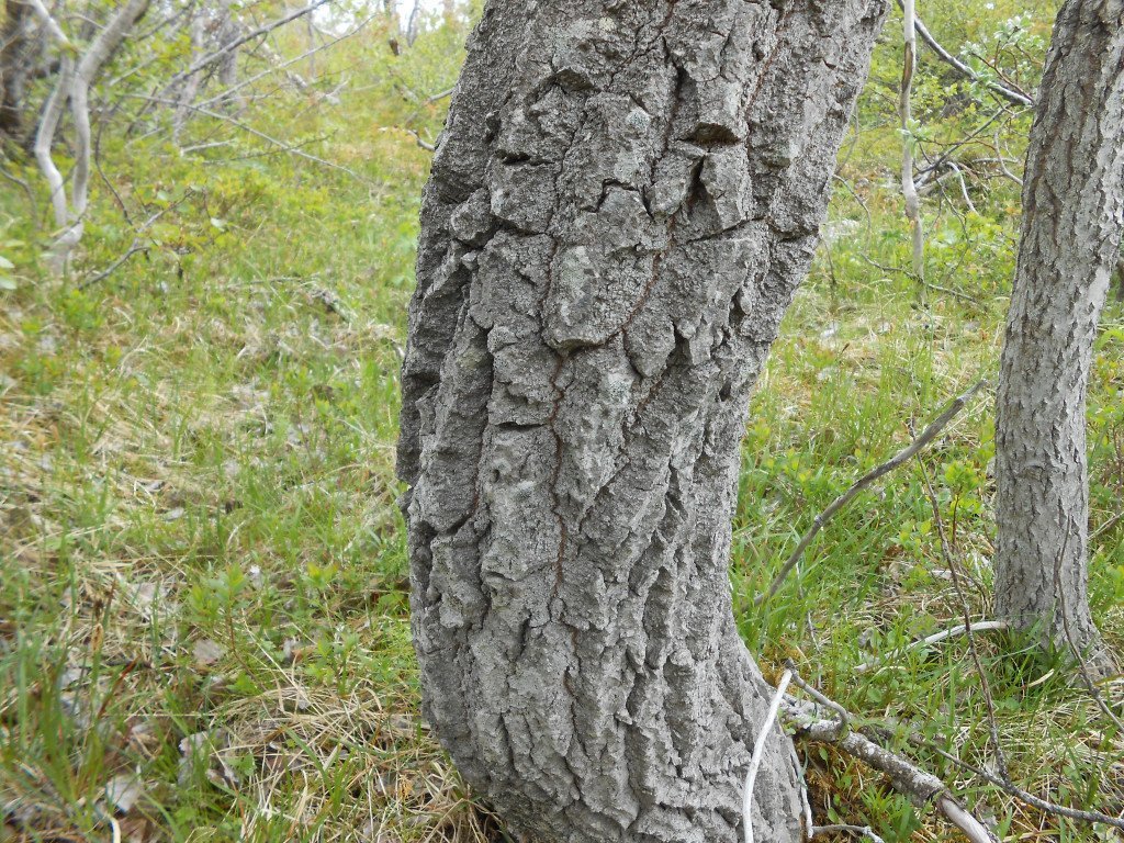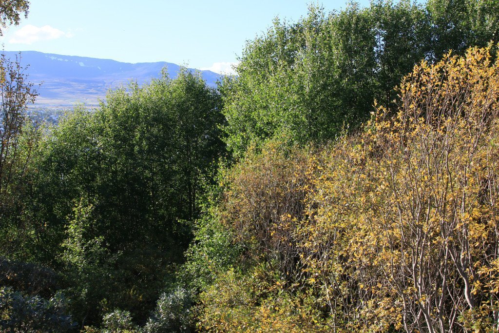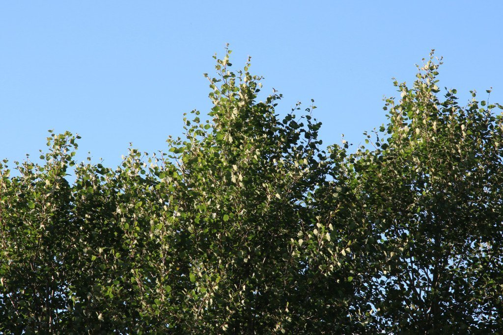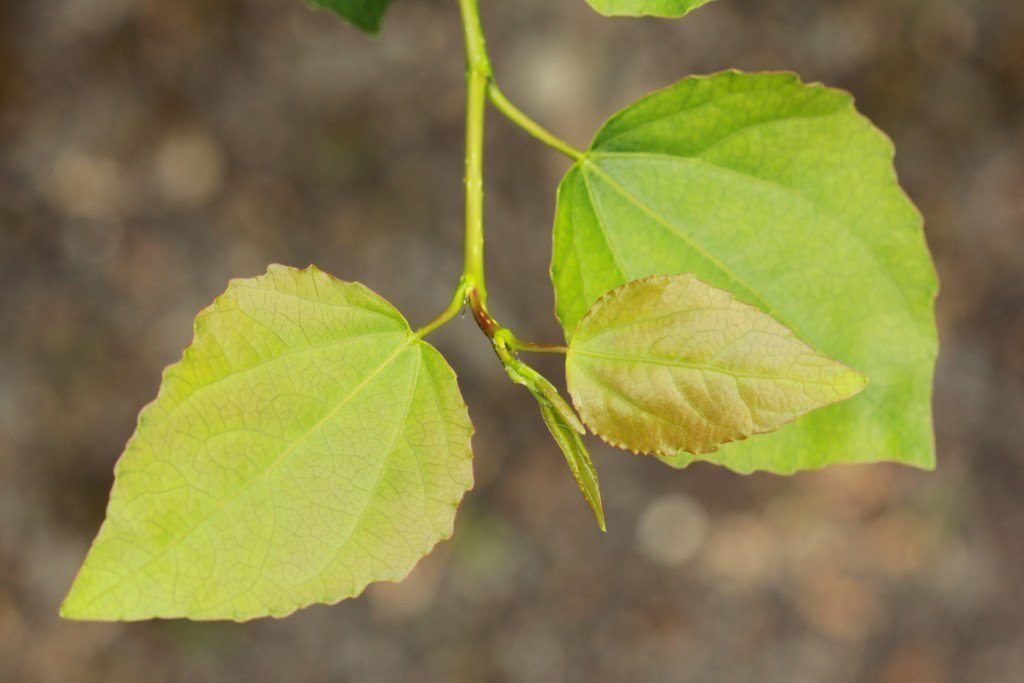 Lauf blæaspar eru rauðbrún í byrjun og því sker tegundin sig gjarnan frá öðrum tegundum í sumarbyrjun. Fljótlega fá þau svo á sig grænan lit. Ljósmynd: Pétur Halldórsson