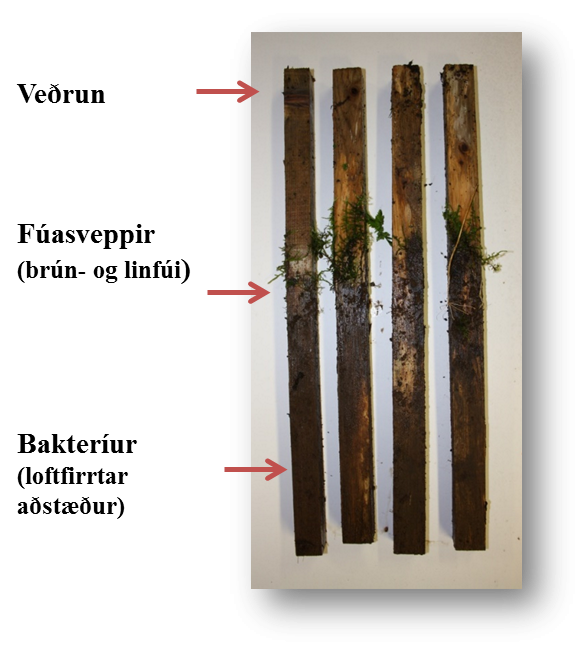 The introduction chapter covers general wood studies, density and durability of wood, and considers the tree species used for the study. The species used for measurements of wood density and durability were: black cottonwood (Populus trichocarpa), Sitka spruce (Picea sitchensis), Norway spruce (Picea abies), and lodgepole pine (Pinus contorta). Lumber used for the research was wood from stands in Haukadalur in Biskupstungur, and fieldwork was conducted on site in spring 2012.