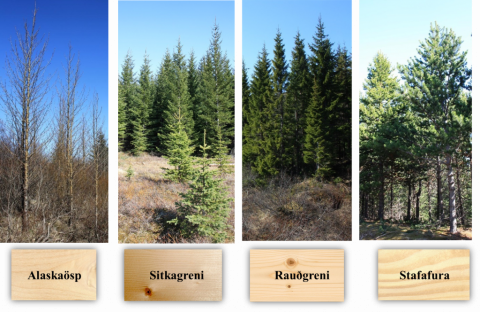 Um 70 ár eru frá því hafist var handa við markvissa nýskógrækt á Íslandi og elstu reitirnir gefa nú af sér hráefni til viðarvinnslu. Fram til þessa hafa fáar rannsóknir verið gerðar á eiginleikum og gæðum trjáviðar hér á landi. Í ritgerðinni er skýrt frá niðurstöðum mælinga á vexti, viðarþéttleika og endingu fjögurra mikilvægra nytjategunda í ræktun á Íslandi, alaskaösp, sitkagreni, rauðgreni og stafafuru. Auk þess er greint frá niðurstöðum mælinga í langtímatilraun á endingu lerkis (af nokkrum tegundum) sem gerð er á Rannsóknastöð skógræktar Mógilsá. Í inngangi er fjallað almennt um viðarfræði, þéttleika, endingu viðar og þær trjátegundir sem koma við sögu í þessari rannsókn. Efniviður fyrir rannsóknina var sóttur í Haukadalsskóg í Biskupstungum og fór vettvangsvinna fram þar vorið 2012.