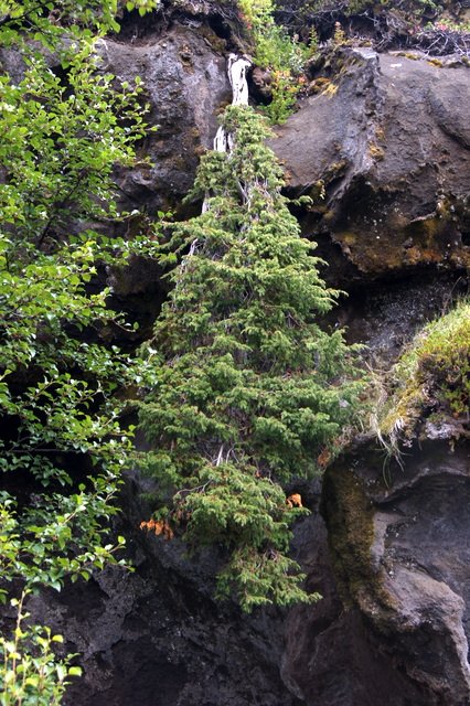 Margar jurtir vaxa í birkiskógunum og hefur einir (Juniperus communis), eina innlenda barrtréð, breiðst mjög út. Má nú finna nokkra áratuga gamlar einiplöntur sem vaxa uppávið ólíkt þeim jarðlægu runnum sem áður sáust einungis á svæðinu. Má búast við að þessar einihríslur haldi áfram að hækka og 2-3 m einirunnar sjáist á svæðinu í framtíðinni. Skógarvörður var á ferðinni í Mörkinni fyrir nokkrum dögum og rakst á afar sérstakan einirunna sem hefur ólíkt öðrum einirunnum tekið upp á því að vaxa niður í móti, en runninn vex fram af klettabrún og hangir fastur á nokkuð sverum gömlum stofni og sterkum rótum. Þennan einstaka einirunna er að finna milli Fremra- og Innra-Slyppugils í Þórsmörk og á hann líklega fáa sína líka í landinu en hann hangir niður fyrir klettabrúnina og teygir sig eina tvo metra. Ekki er gott að segja hversu löng rótin er ofan við runnan en líklega er hún nokkrir metrar á lengd. Gæti þessi runni verið afar gamall, en einir getur orðið mörg hundruð ára gamall. Meðfylgjandi myndir af uppréttum einirunnum og hangandi einirunnanum segja meira en mörg orð.
