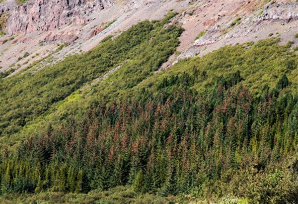 Nú síðla sumars hefur roði á greni valdið áhugafólki um skógrækt áhyggjum og hafa einhverjir óttast að um miklar skemmdir sé að ræða. Sú er þó sem betur fer ekki raunin því trén eru einfaldlega rauðbrún af könglum.