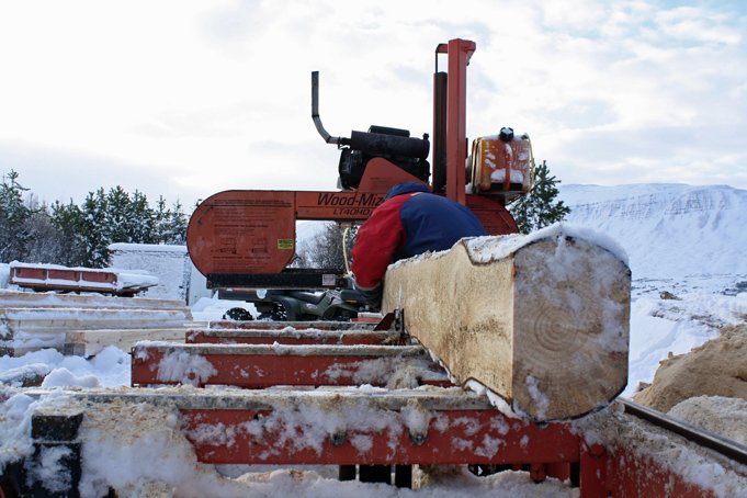 Aðkoma Skógrækt ríkisins að endurbyggingunni er sú að stofnunin leggur til timbur í húsið. Í gær, miðvikudaginn 2. mars, lauk Vesturlandsdeild Skógræktar ríkisins við að fletta borð og planka úr greni í húsið. Til verksins er notuð bandsög sem Gísli Baldur, starfsmaður Skógræktar ríkisins, sést brúka á meðfylgjandi myndum.