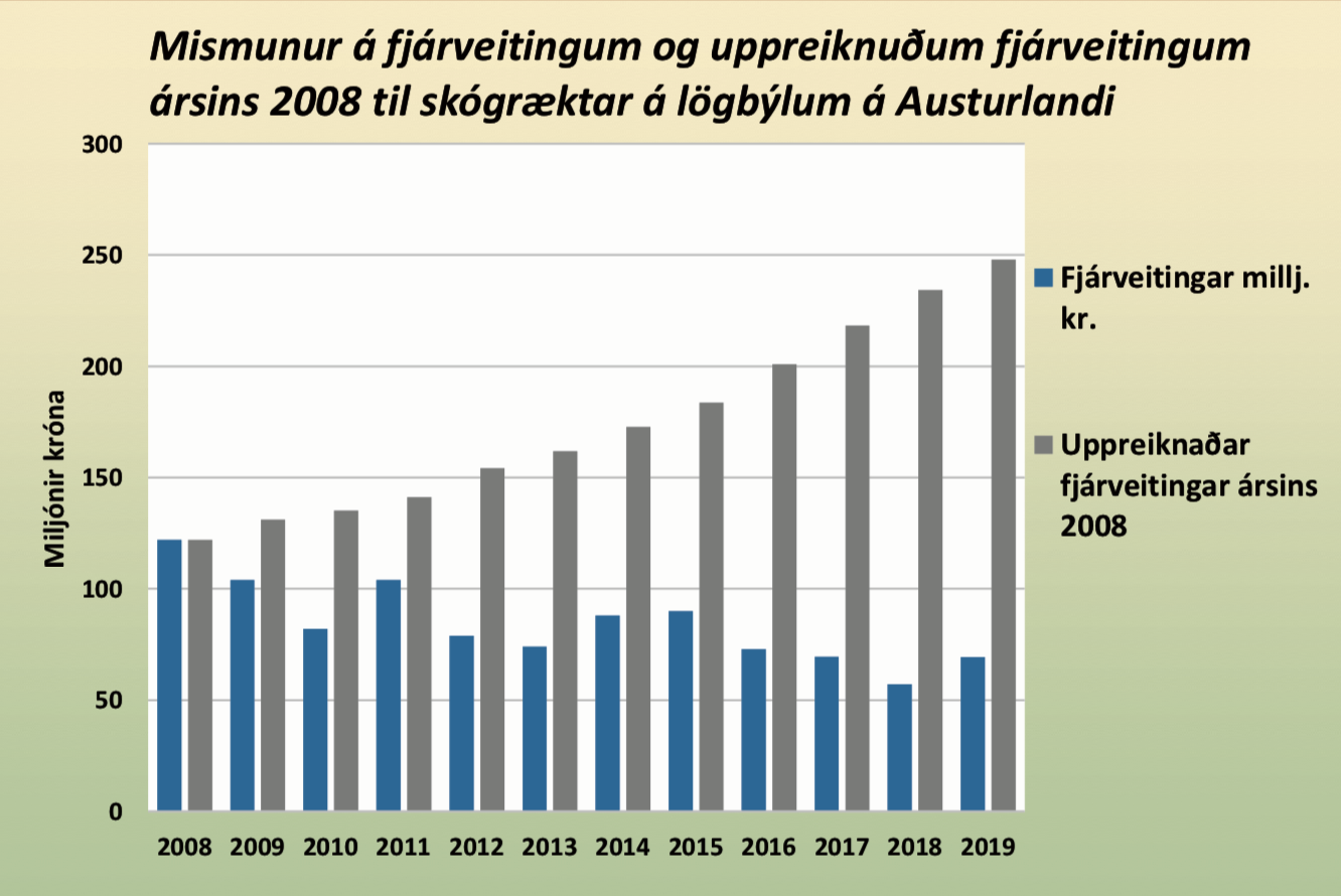 „Frá 2008 hefur orðið meira en 40% samdráttur í fjárveitingum og umsvifum í skógrækt á lögbýlum vegna þess að ríkið stendur ekki við samninga við bændur og þrátt fyrir að í þeim sé gert ráð fyrir að það taki 10 ár að gróðursetja á hverju lögbýli tæki það 40 ár að uppfylla fyrirliggjandi samninga, miðað við fjárveitingar 2019.