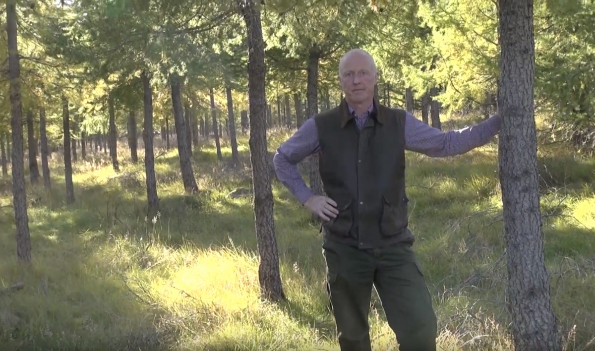 Jóhann Þórhallsson í fyrirmyndarskógi á jörð sinni Brekkugerði. Fjármagn vantar svo að hirða megi svona vel um skóga sem víðast á jörðum bænda, grisja og uppkvista svo að skógarnir gefi hámarksverðmæti í fyllingu tímans. Skjámynd úr myndbandi eftir Hlyn Gauta Sigurðsson