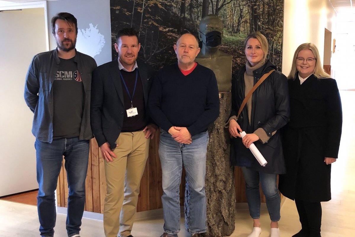 Að lokinni undirskrift samningsins á aðalskrifstofu Skógræktarinnar í vikunni. Frá vinstri: Gunnlaugur Guðjónsson, sviðstjóri rekstrarsviðs Skógræktarinnar, Páll Snorrason, framkvæmdastjóri rekstrar- og fjármálasviðs Eskju, Þröstur Eysteinsson skógræktarstjóri, Erna Þorsteinsdóttir, stjórnarformaður Eskju, og Sigrún Ísaksdóttir, skrifstofustjóri hjá Eskju.