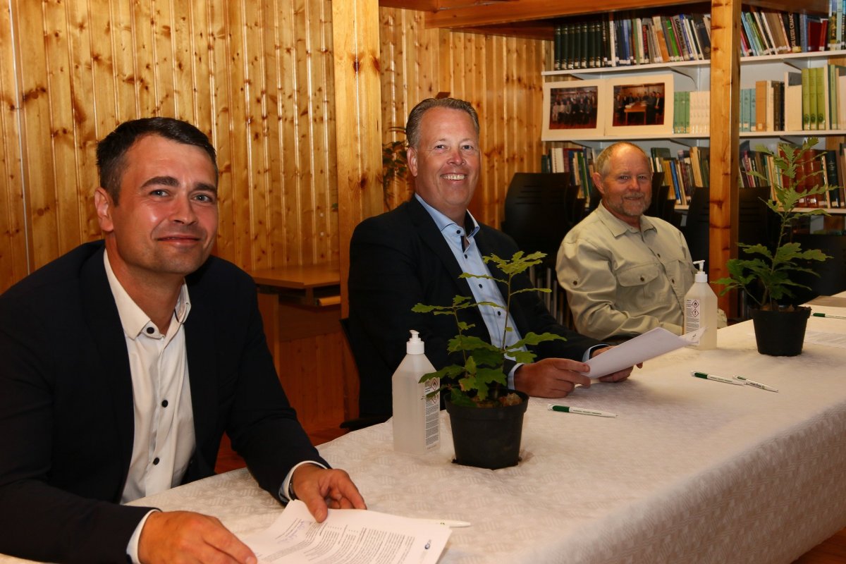 Guðmundur Sigbergsson, framkvæmdastjóri Loftslagsskrár Íslands, Eggert Þór Kristófersson, forstjóri Festi, og Þröstur Eysteinsson skógræktarstjóri við undirritun samninga á Mógilsá í liðinni viku. Ljósmynd: Pétur Halldórsson