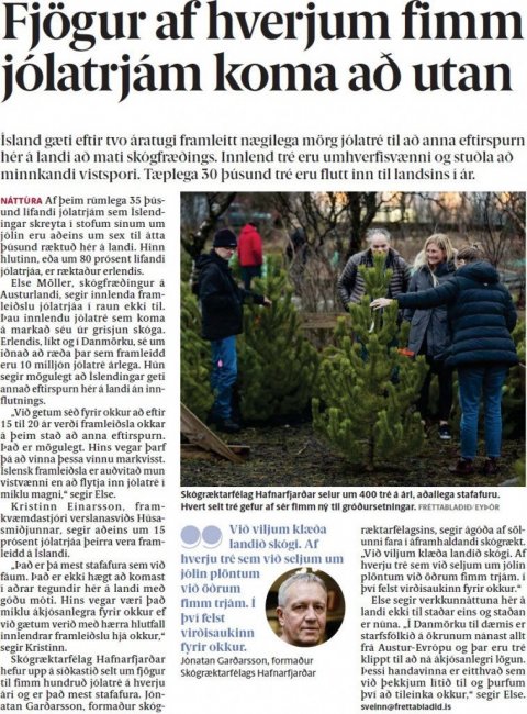 Fram kemur að Ísland gæti eftir tvo áratugi framleitt nægilega mörg jólatré til að anna eftirspurn hér á landi að mati skóg­fræð­ings. Innlend tré séu umhverfisvænni og stuðli að minnkandi vistspori. Tæplega 30 þúsund tré séu flutt inn til landsins í ár.