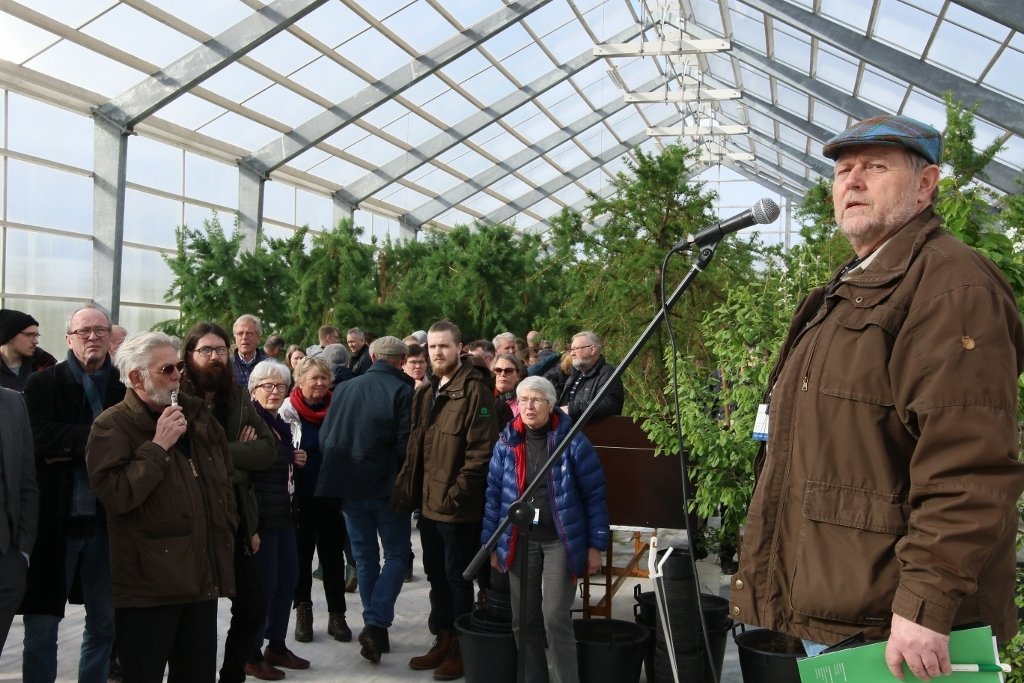 Vettvangsferð í fræhöllina á Vöglum í Fnjóskadal var á dagskrá ráðstefnunnar fyrri daginn. Þar var fræframleiðsla Skógræktarinnar kynnt og kynbótastarf með lerki, fjallaþin, stafafuru og fleira. Hér ávarpar Þröstur Eysteinsson skógræktarstjóri hópinn og segir frá ræktun lerkiblendingsins Hryms sem fram fer í fræhöllinni.