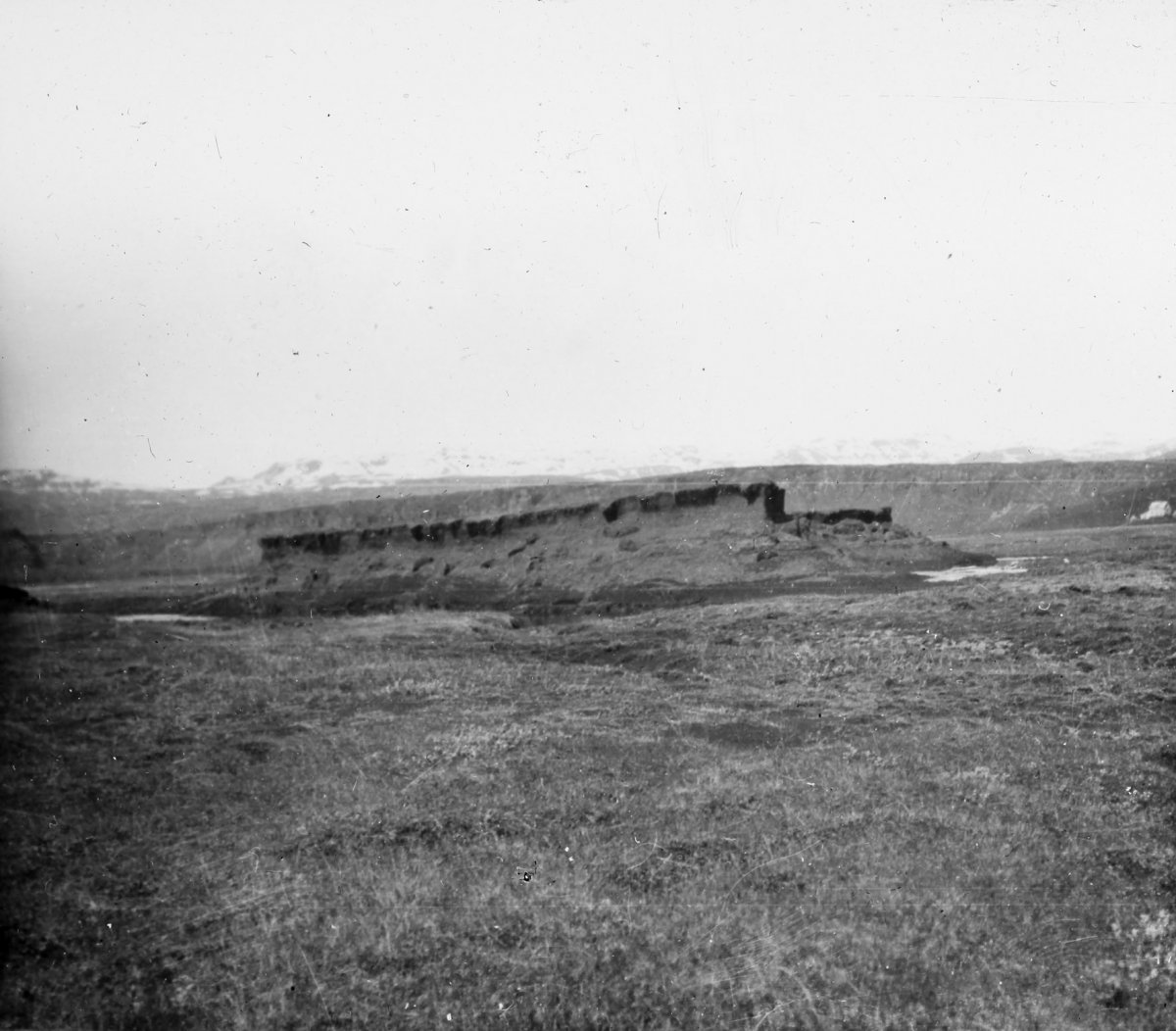 Þessa mynd tók Kofoed-Hansen líklega sjálfur á óþekktum stað á ferðum sínum um landið. Rofabörð sem þessi hafa víða blasað við honum á leiðinni um Vatnajökulsveg. Ljósmynd af glerplötu úr eigu Skógræktarinnar.