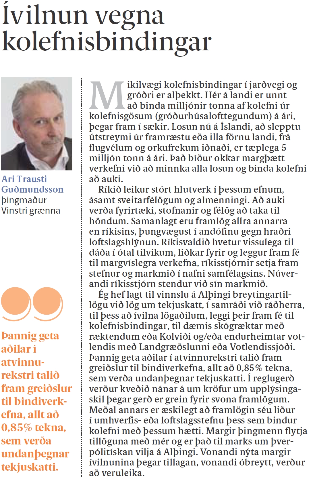Grein Ara Trausta í FréttablaðinuHann bendir á að mikilvægi kolefnisbindingar í jarðvegi og gróðri sé alþekkt. Hér á landi sé unnt að binda milljónir tonna af kolefni úr kolefnis­gös­um (gróðurhúsalofttegundum) á ári, þegar fram í sækir. Losun nú á Íslandi, að slepptu útstreymi úr framræstu eða illa förnu landi, frá flugvélum og orkufrekum iðnaði, séu tæplega 5 milljónir tonna á ári. Íslendinga bíði margþætt verkefni við að minnka alla losun og binda kolefni að auki.
