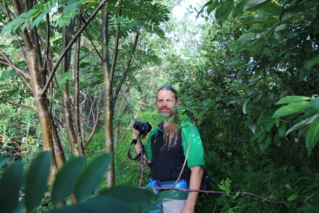 Jan Klitgard stendur þar sem girðingin stóð áður. Við fyrstu sýn mætti halda að myndin væri úr suðrænum regnskógi en hér hefur alaskavíðirinn vaxið upp þar sem áður var rofið land og reyniviður borist í landið líka, sennilega með fuglum. Myndina tók Árni Sigurbjarnarson 2016.