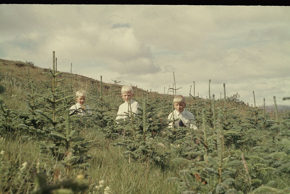 Hér sitja þeir Hrafn, Úlfur og Örn Óskarssynir innan um sitkagrenitrén sem gróðursett voru í Skógarhlíð á Snæfoksstöðum 1960.
