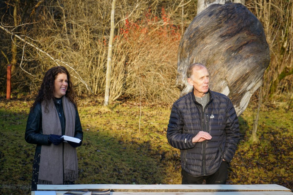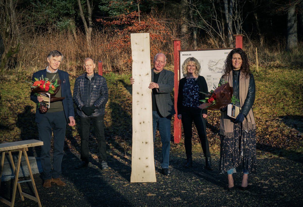 Að afhendingu lokinni á Mógilsá. Frá vinstri: Hallgrímur Jónasson, forstöðumaður Rannís, Björn B. Jónsson Skógræktinni, Eiríkur Þorsteinsson Trétækniráðgjöf, Guðríður Helgadóttir LbhÍ og Þórdís Kolbrún R. Gylfadóttir ráðherra. Ljósmynd: Rósa Björk Jónsdóttir