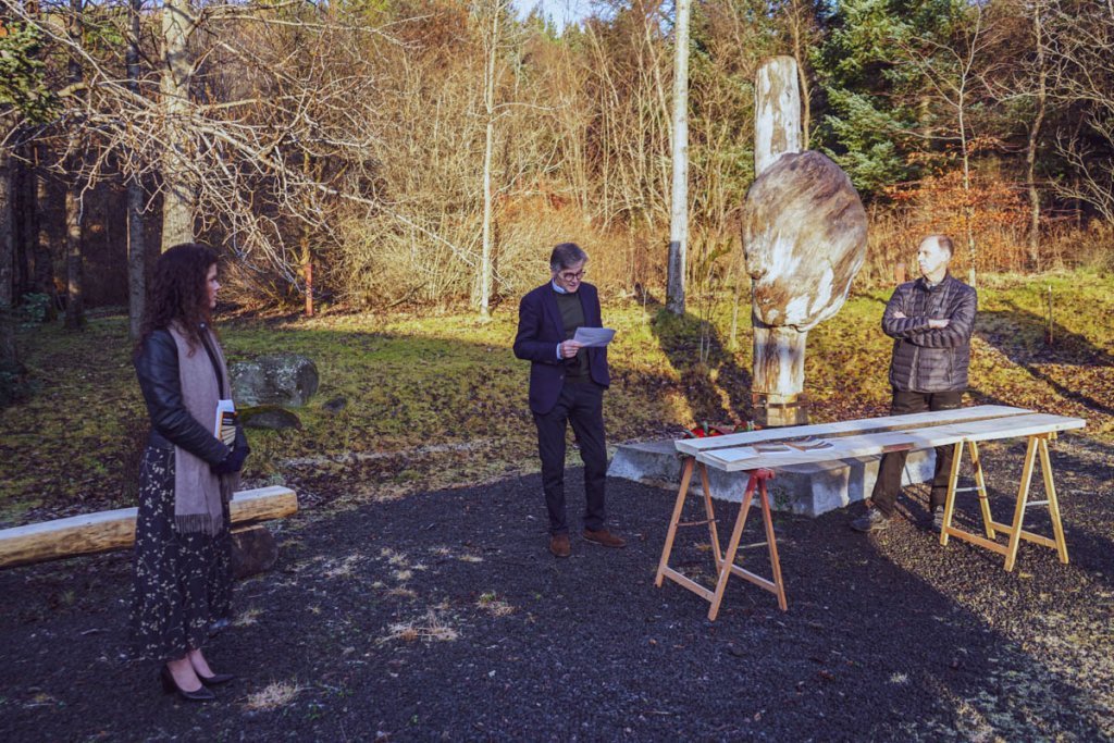 Meðfylgjandi myndir voru teknar á Mógilsá þegar ráðherra tók við fyrsta eintakinu af Gæðafjölum föstudaginn 13. nóvember 2020 ásamt Hallgrími Jónassyni, forstöðumanni Rannís. Ráðherra lýsti mikilli ánægju sinni með þennan áfanga og hvatti fólk í skógrækt og skógariðnaði til að halda starfinu áfram að nýsköpun á sviði timburnytja hérlendis. Auk bókarinnar þáði ráðherra að gjöf myndarlega fjöl úr íslensku greni sem nú prýðir ráðuneyti iðnaðar- og nýsköpunarmála og vekur athygli á skógarauðlindinni sem er að byggjast upp í landinu.