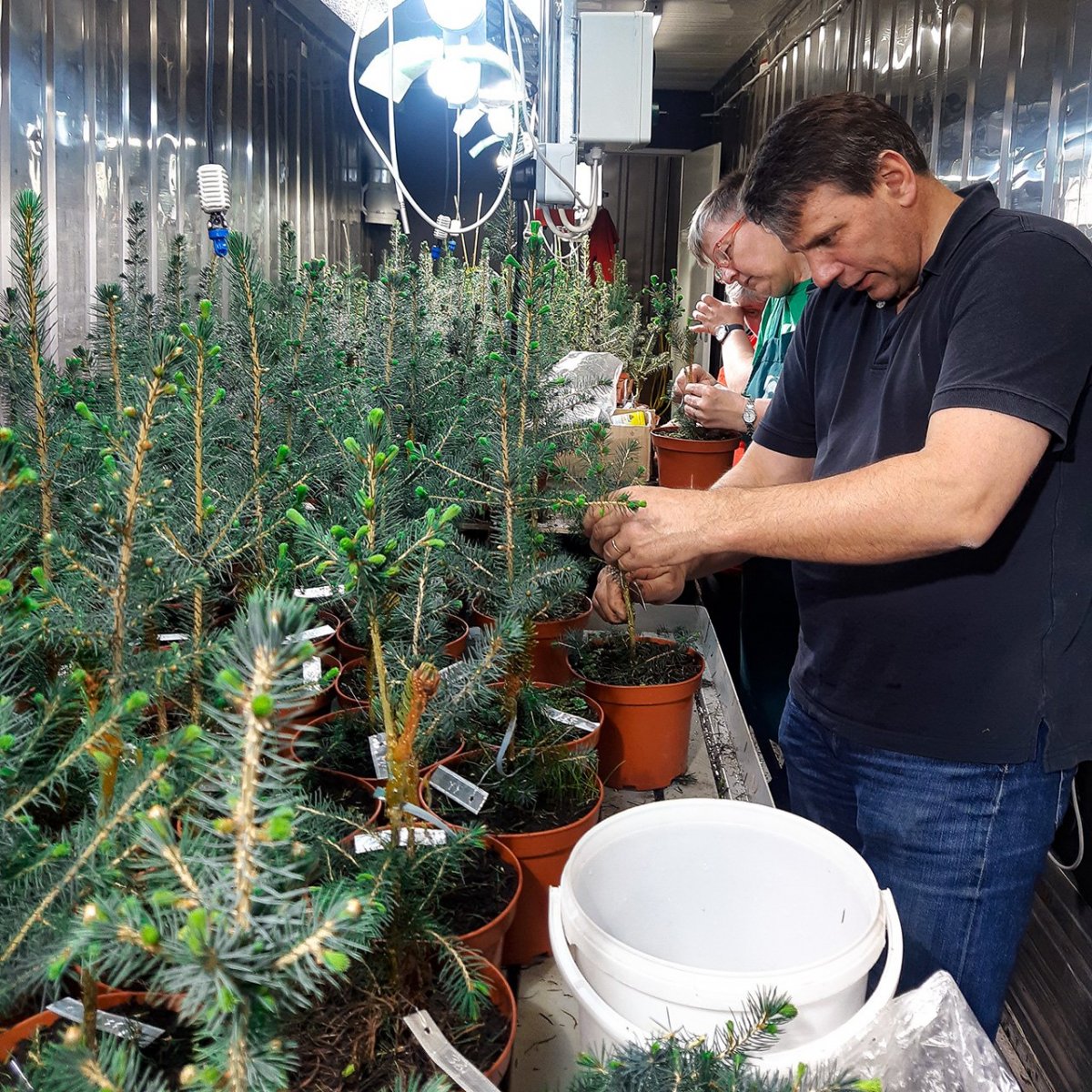 Yfirumsjón með þessu starfi hefur Brynjar Skúlason skógerfðafræðingur sem hér sést á meðfylgjandi mynd ásamt Valgerði Jónsdóttur, verkefnastjóra fjölgunarefnis hjá Skógræktinni og bak við hana glittir í Þuríði Davíðsdóttur, starfsmann á Vöglum. Myndin er tekin í ræktunargámi Skógræktarinnar á Vöglum þar sem fram fara tilraunir, gæðaprófanir á plöntum, stýrð ræktun og fleira.