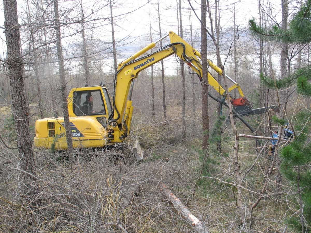 Þessa daganna er verið að grisja í lerkireitum í Hallormsstaðaskógi sem gróðursettir voru árið 1983. Nú vill svo óvenjulega til að unnið er á tveimur vélum samtímis að grisjuninni, þ.e. fellingu og afkvistun. Efnið er síðan keyrt út úr skóginum með traktor og komið fyrir á timburvagni. Fellingin er unnin af verktökum á Fljótsdalshéraði, þeim Sveini Ingimarssyni og Einari Guðsteinssyni, sem eru með 6 og 10 tonna gröfur með felli og afkvistunarhaus annars vegar og klippihaus hins vegar. Áætlað er að fella og keyra út úr skóginum um 450 m3 af grisjunarviði þetta vorið.