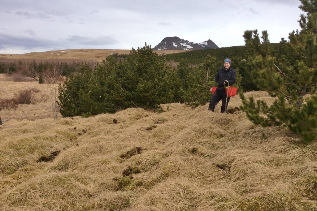 Lucile Delfosse, skógfræðingur og starfsmaður Skógræktarinnar, við gróðursetningu sitkagrenis í svokölluðum Kollabæjarfjallgarði í Fljótshlíð. Nær snjólaus Þríhyrningur í baksýn.
