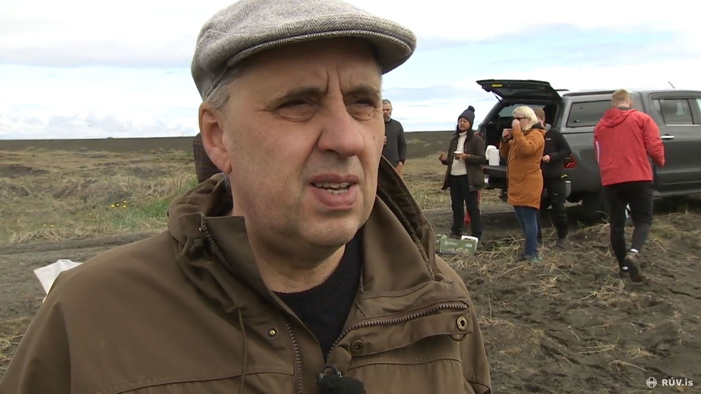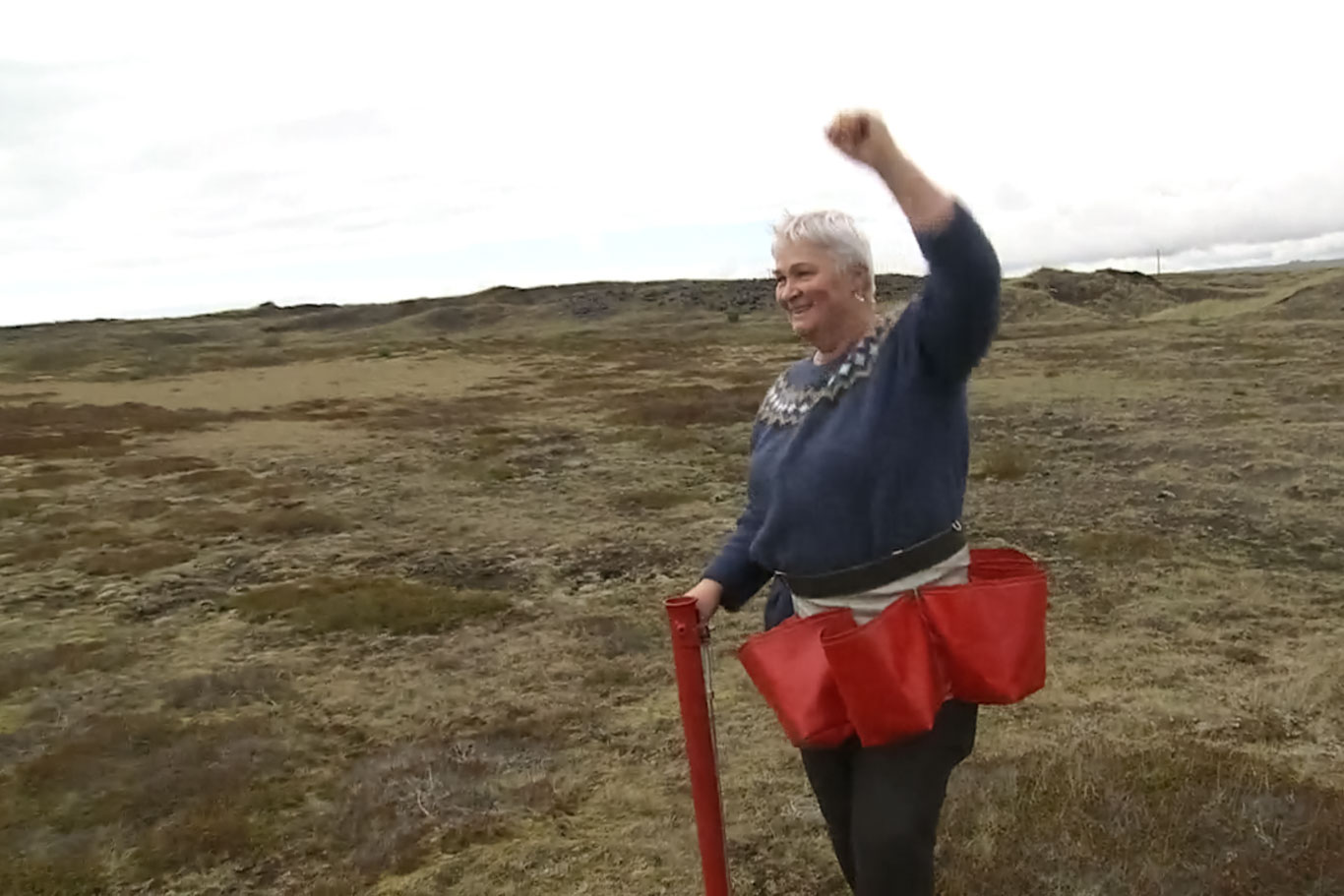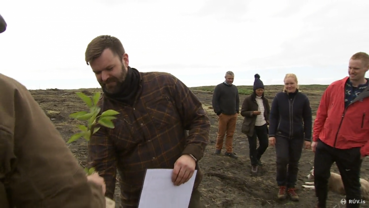 Trausti Jóhannsson, skógarvörður á Suðurlandi, tekur við viðurkenningarskjali og fallegri asparplöntu fyrir þátttöku sína í gróðursetningarkeppnini sem fram fór á Hafnarsandi. Skjámynd úr umfjöllun Sumarlandans