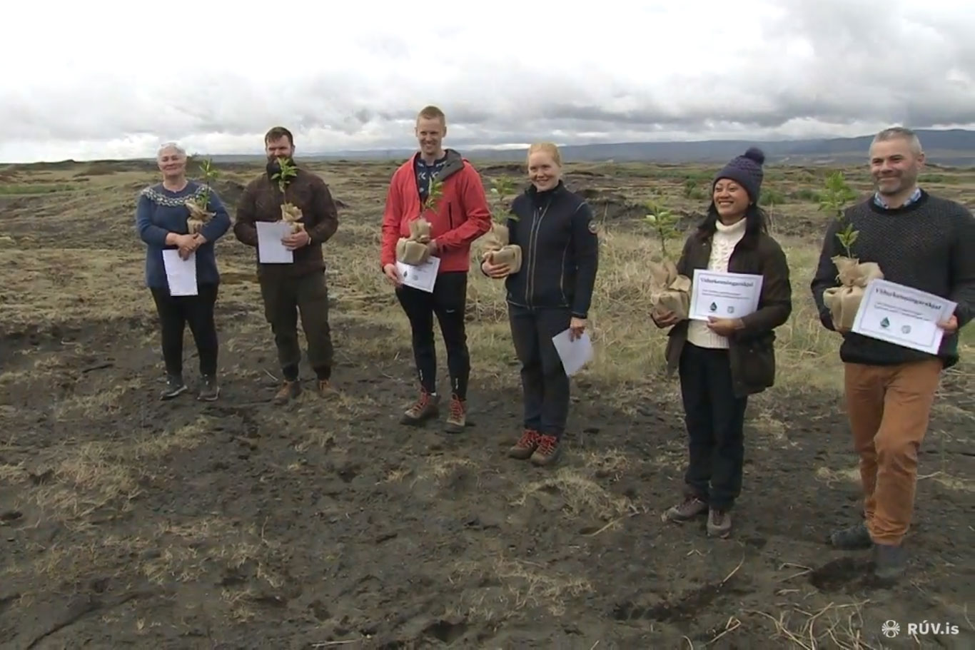 Keppendur hróðugir með viðurkenningarskjal og fallega ösp að keppni lokinni. Skjámynd úr umfjöllun Sumarlandans