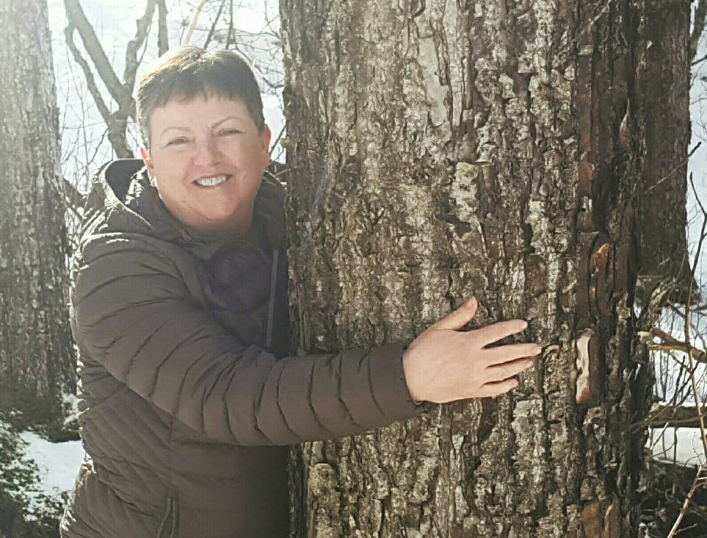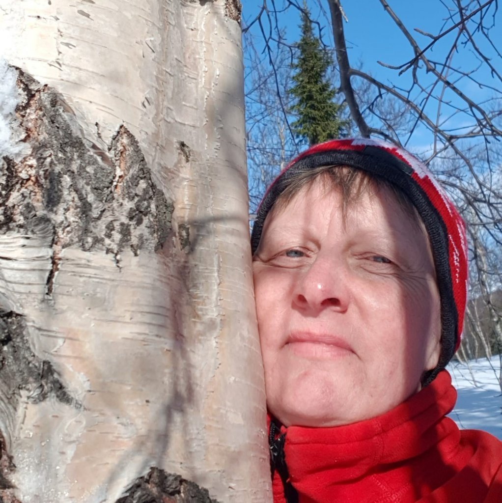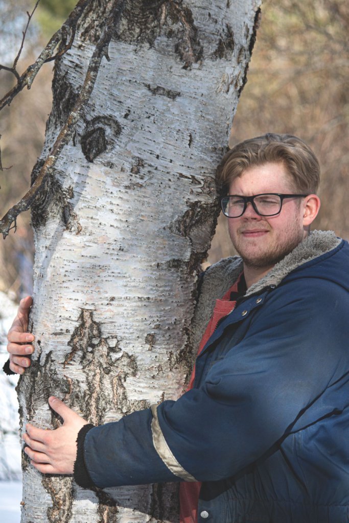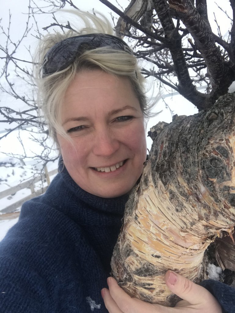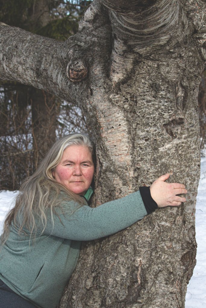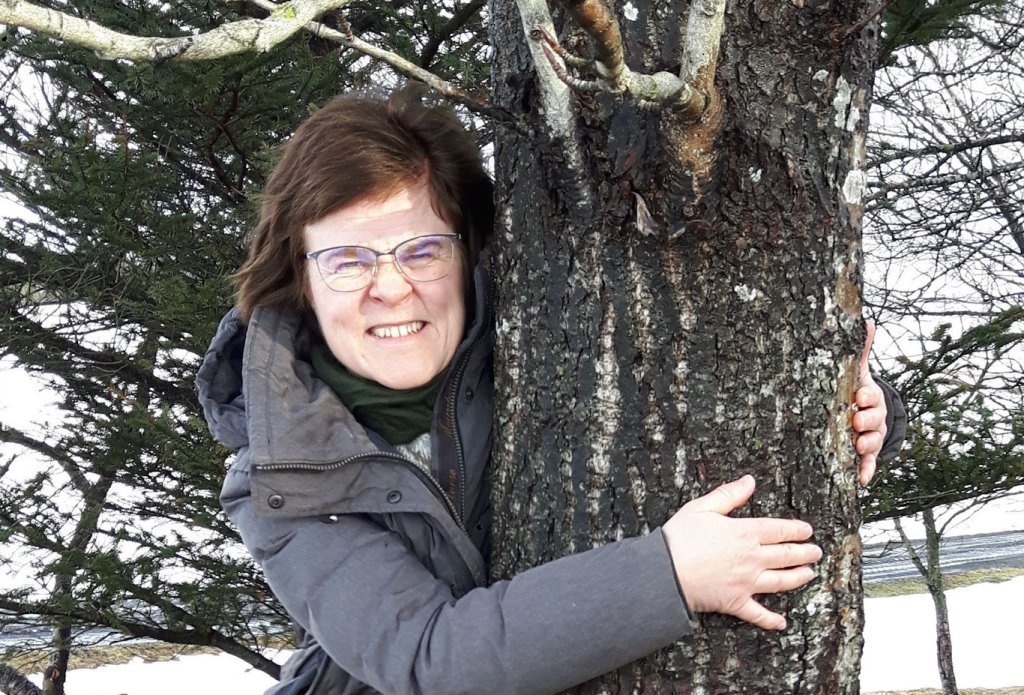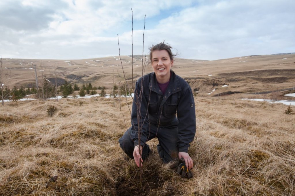 Lucile Delfosse, skógfræðingur og skógarhöggsmaður hjá Skógræktinni á Tumastöðum í Fljótshlíð, við birkitréð sem gróðursett var til heiðurs Vigdísi á níræðisafmæli hennar. Ljósmynd: Hrafn Óskarsson