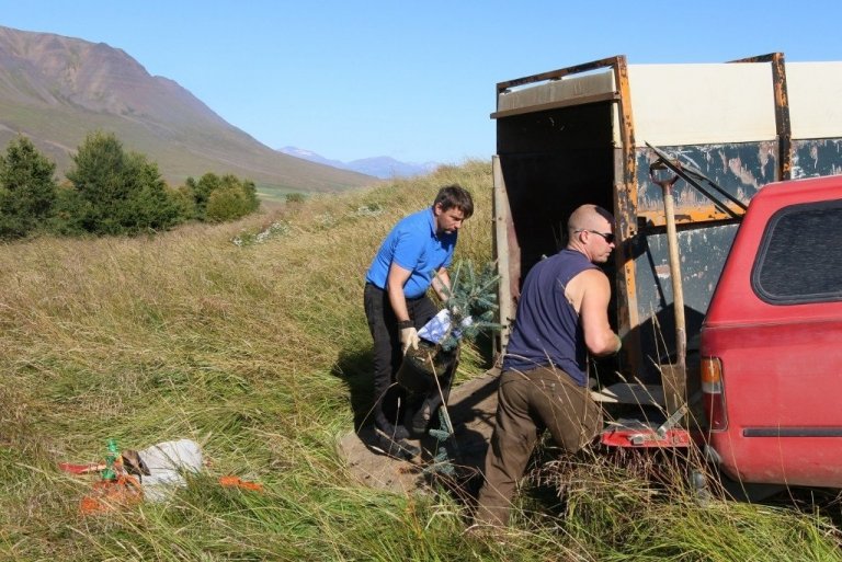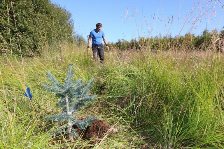 Brynjar gróðursetur fyrsta tré í frægarð fjallaþins til jólatrjáaræktar.