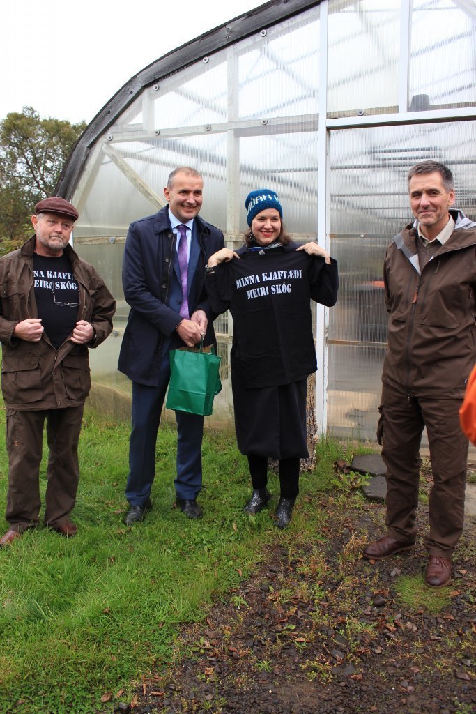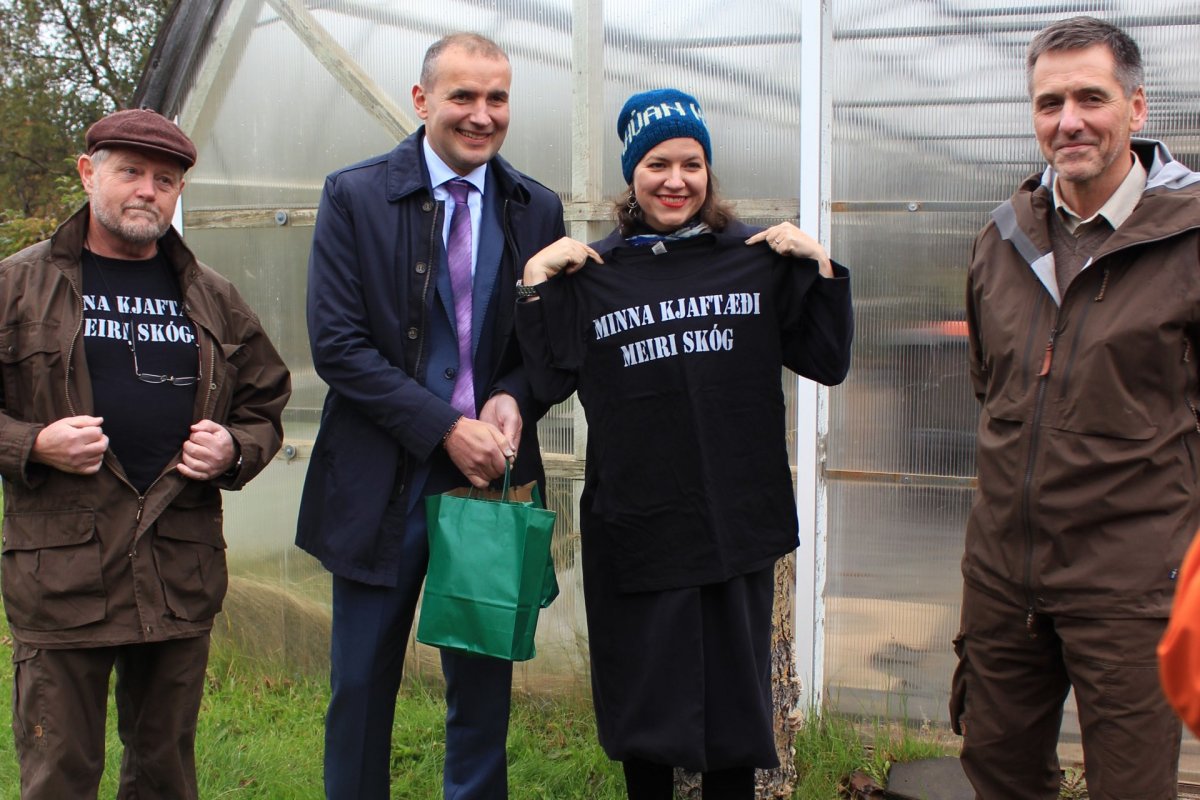 Skógræktarstjóri (t.v.) færði forsetahjónunum að gjöf boli með áletruninni MINNA KJAFTÆÐI, MEIRI SKÓ…