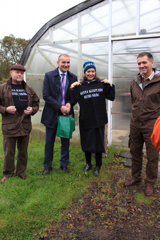 Skógræktarstjóri (t.v.) færði forsetahjónunum að gjöf boli með áletruninni MINNA KJAFTÆÐI, MEIRI SKÓG. Lengst til hægri stendur Þór Þorfinnsson skógarvörður. Ljósmynd: Bergrún Arna Þorsteinsdóttir